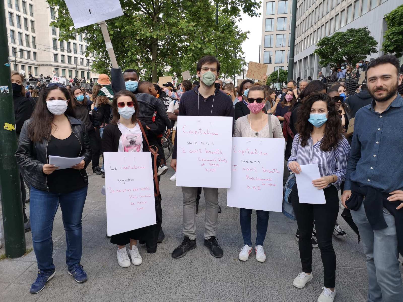 Στη διαδήλωση συμμετείχε και η Κομματική Οργάνωση Βελγίου του ΚΚΕ με το σύνθημα “Capitalism means I can’t breathe”.