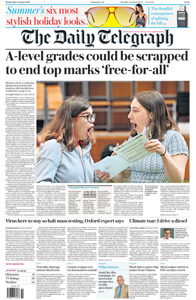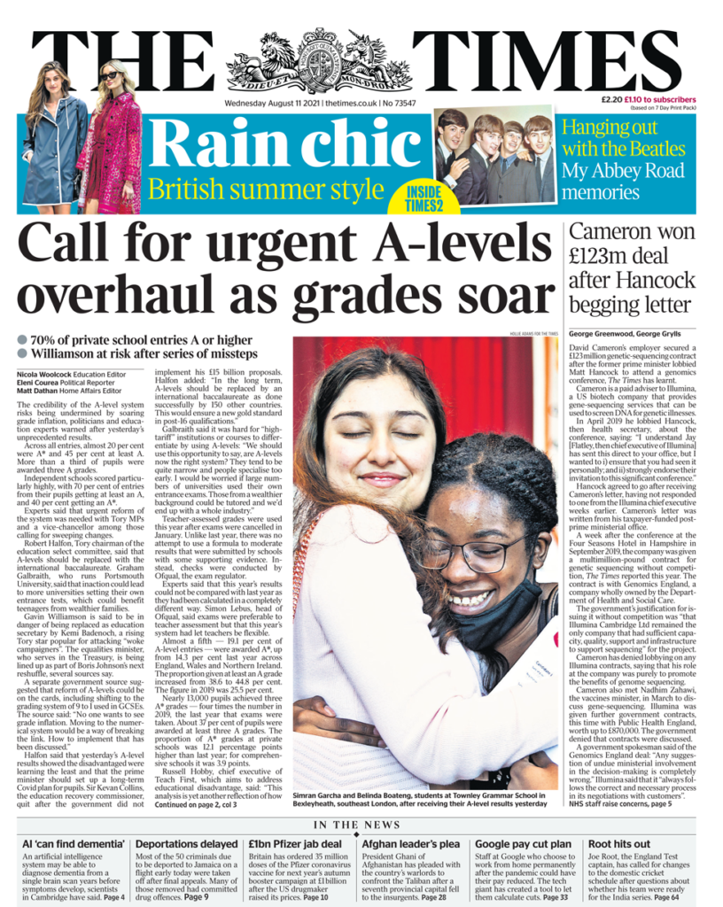 Τα περισσότερα από τα πρωτοσέλιδα της Τετάρτης εκφράζουν ανησυχία για το διευρυνόμενο χάσμα μεταξύ κρατικών και ιδιωτικών σχολείων που φαίνεται στα αποτελέσματα της Τρίτης. Η Daily Telegraph αποκαλύπτει ότι εξετάζεται ως λύση να καταργηθούν οι αλφαβητικοί βαθμοί, από το Α έως το Ε και να αντικατασταθούν με αριθμούς, παρόμοια με το GCSE, καθώς βουλευτής είπε ότι το χάσμα στην βαθμολογία μεταξύ μαθητών ιδιωτικών και κρατικών σχολείων, θα μπορούσε να είναι “εθνική καταστροφή”. Οποιοδήποτε σχέδιο για την αλλαγή του συστήματος βαθμολόγησης θα απαιτούσε χρόνο για να εφαρμοστεί, σημειώνει η εφημερίδα. Το άρθρο, προειδοποιεί ότι το κλείσιμο σχολείων κατά τη διάρκεια της πανδημίας ήταν “καταστροφή και δεν πρέπει να επαναληφθεί”