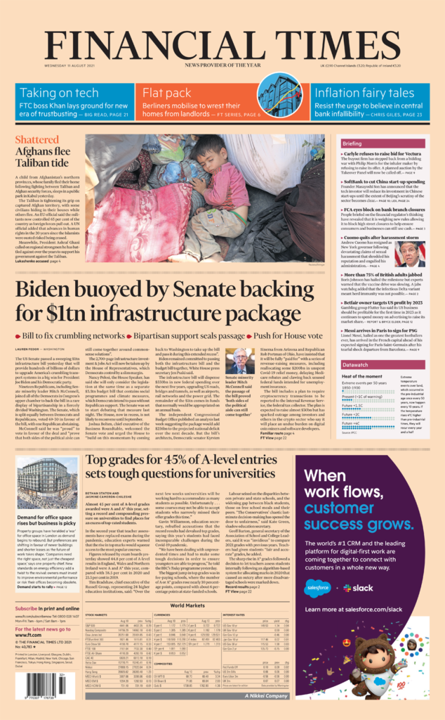 Οι Financial Times ασχολούνται με την ψήφιση ενός τεράστιου λογαριασμού για υποδομές, αξίας 1 τρις. δολαρίων, από τη Γερουσία των ΗΠΑ. Η εφημερίδα αναφέρει ότι σε μια “σπάνια επίδειξη δικομματισμού” πέρασε το νομοσχέδιο με 69-30, ενώ τώρα πρέπει να περάσει και από την διχασμένη Βουλή των Αντιπροσώπων. Ένα από τα θέματα στην πρώτη σελίδα της Guardian, γράφεται από μια ανώνυμη 22χρονη γυναίκα δημοσιογράφο διώκεται από το Αφγανιστάν αφού οι Ταλιμπάν κατέλαβαν την πόλη της στα βόρεια της χώρας. Περιγράφει την ιστορία της, φορώντας μπούρκα σε ένα αυτοκίνητο με τον θείο της, ή με τα πόδια για να αποφύγει τα σημεία ελέγχου των Ταλιμπάν, τρομοκρατημένη, εξηγώντας ότι φεύγει επειδή οι μαχητές αναγκάζουν τις οικογένειες να δώσουν τις κόρες τους, ως γυναίκες για τους μαχητές τους.