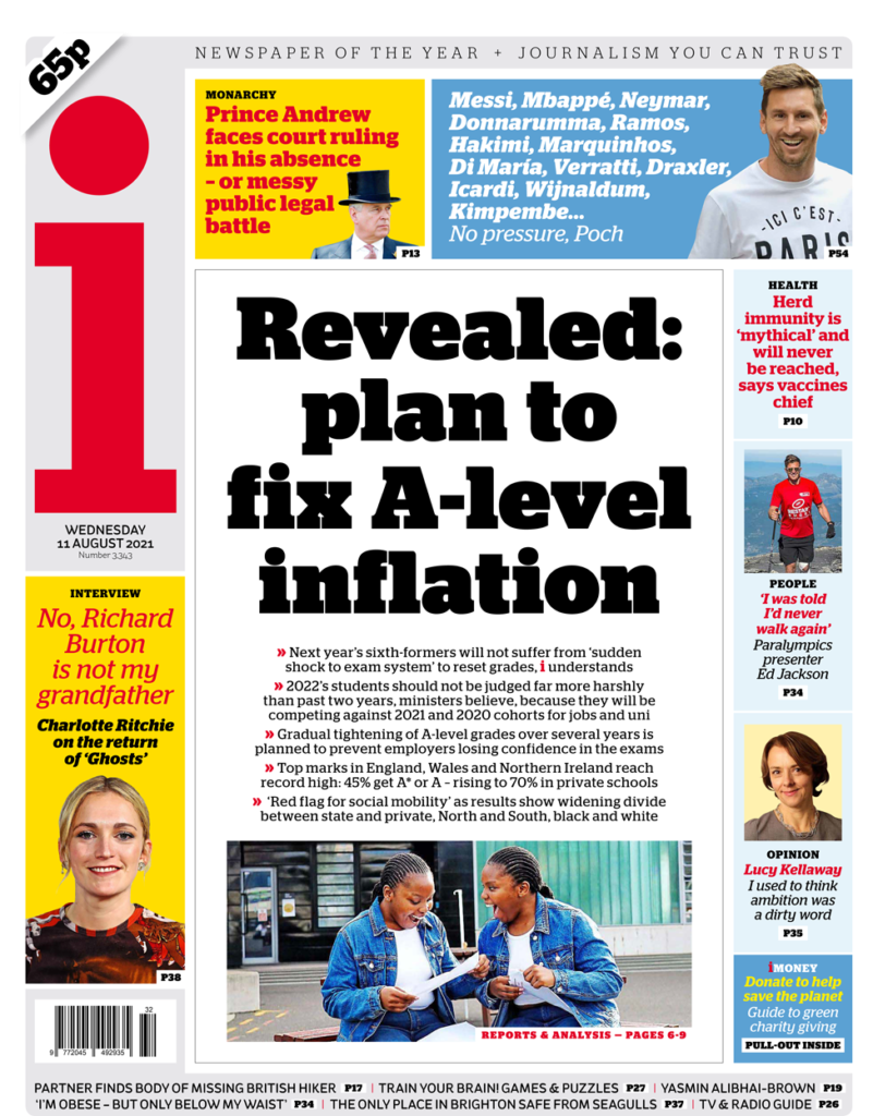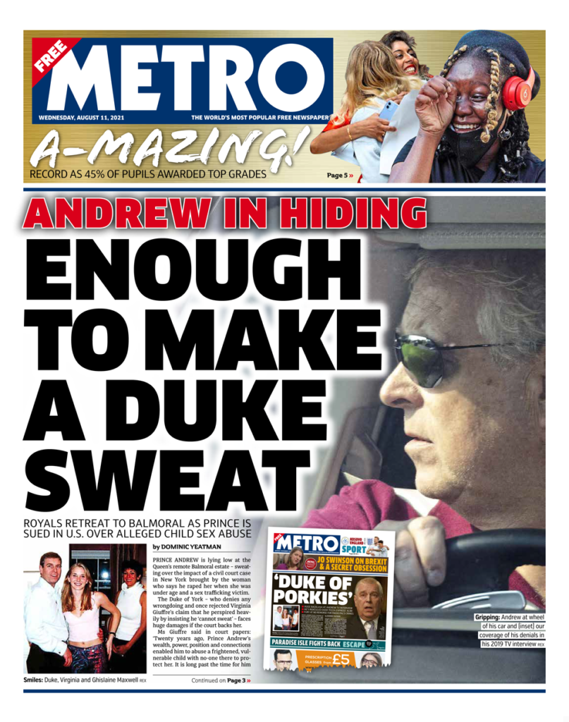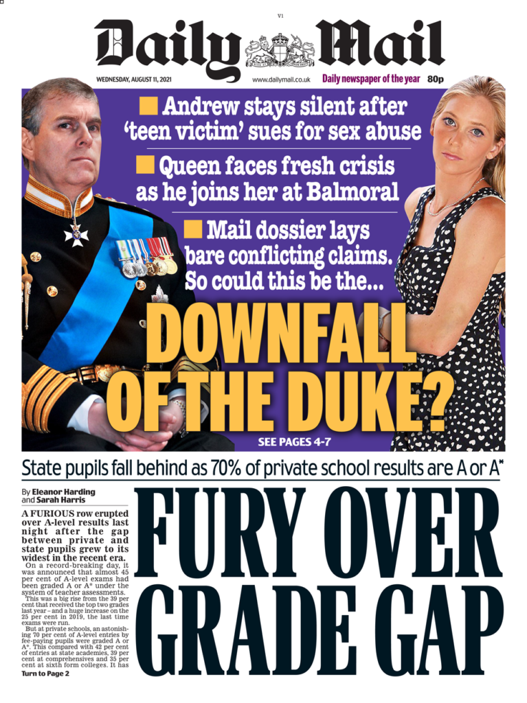 “Η Πτώση του Δούκα της Υόρκης;” αναρωτιέται η Daily Mail, επισημαίνοντας ότι ο πρίγκιπας Andrew “μένει σιωπηλός” μετά την αγωγή της κυρίας Giuffre στη Νέα Υόρκη. Ισχυρίζεται ότι η βασίλισσα αντιμετωπίζει μια νέα κρίση με το δεύτερο γιο της, ο οποίος βρίσκεται μαζί της στο Balmoral. Η εφημερίδα αναφέρεται στην “οργή σχετικά με το χάσμα στην βαθμολογία” μετά τα αποτελέσματα της Τρίτης, προσθέτοντας ότι οι βαθμοί δείχνουν τον τρόπο με τον οποίο οι ανισότητες έχουν επιδεινωθεί από την πανδημία, καθώς σχεδόν το 45% όλων των μαθητών έλαβαν Α και Α+ ενώ πριν από την πανδημία, το 2019, το ποσοστό ήταν μικρότερο από 26%.