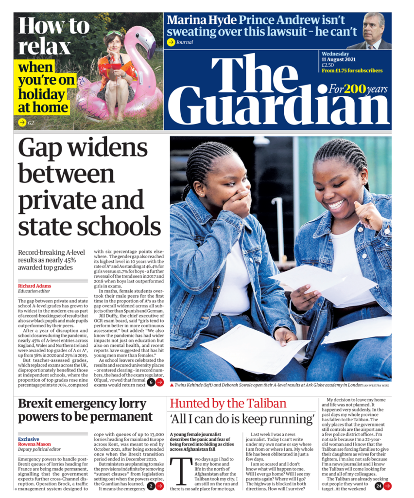 Το χάσμα μεταξύ μαθητών ιδιωτικών και κρατικών σχολείων, απασχολεί και την Guardian. Η εφημερίδα σημειώνει ότι οι βαθμοί «ωφέλησαν δυσανάλογα εκείνους στα ιδιωτικά σχολεία». Εν τω μεταξύ, η ρυθμιστική αρχή των εξετάσεων, η Ofqual, έχει δεσμευτεί πως οι επίσημες εξετάσεις θα επιστρέψουν το επόμενο έτος. Η Guardian λέει ότι το χάσμα έχει αυξηθεί στο μεγαλύτερο επίπεδο της σύγχρονης εποχής, με το 70% των μαθητών σε ιδιωτικά σχολεία να λαμβάνουν Α ή Α+ βαθμολογίες, ενώ μόνο περίπου το 40% των μαθητών στα κρατικά σχολεία κατάφεραν το ίδιο.