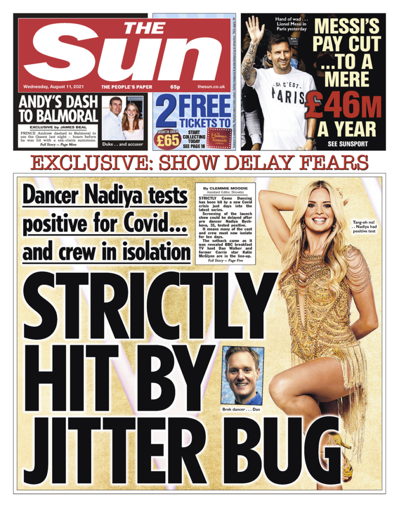 Η εκπομπή του BBC, Strictly Come Dancing, επλήγη από τον Covid, σύμφωνα με τη Sun. Υπάρχει χάος, υποστηρίζει η εφημερίδα καθώς το θετικό τεστ που προέκυψε, θα μπορούσε να θέσει σε κίνδυνο και να καθυστερήσει τη νέα σειρά, εξηγώντας ότι μία από τις συμμετέχουσες, η επαγγελματίας χορεύτρια Nadya Bychkova, βρέθηκε θετική στον κορονοϊό. Πολλοί από το καστ δεν μπορούν να συνεχίσουν και πρέπει τώρα να απομονωθούν για 10 ημέρες, όπως υποστηρίζει η εφημερίδα.