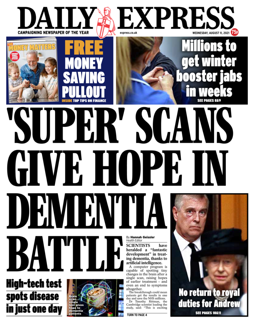 Θετικά νέα, στο πρωτυοσέλιδο της Daily Express. Οι επιστήμονες αποκάλυψαν μια “φανταστική εξέλιξη” στη θεραπεία της άνοιας. Η εφημερίδα γράφει ότι η ανακάλυψη θα μπορούσε άμεσα να εντοπίσει αλλαγές στον εγκέφαλο πράγμα που σημαίνει ότι οι ασθενείς θα έχουν τα αποτελέσματα, “σε μια μέρα, γεγονός που θα εξοικονομήσει εκατομμύρια από το NHS”.
