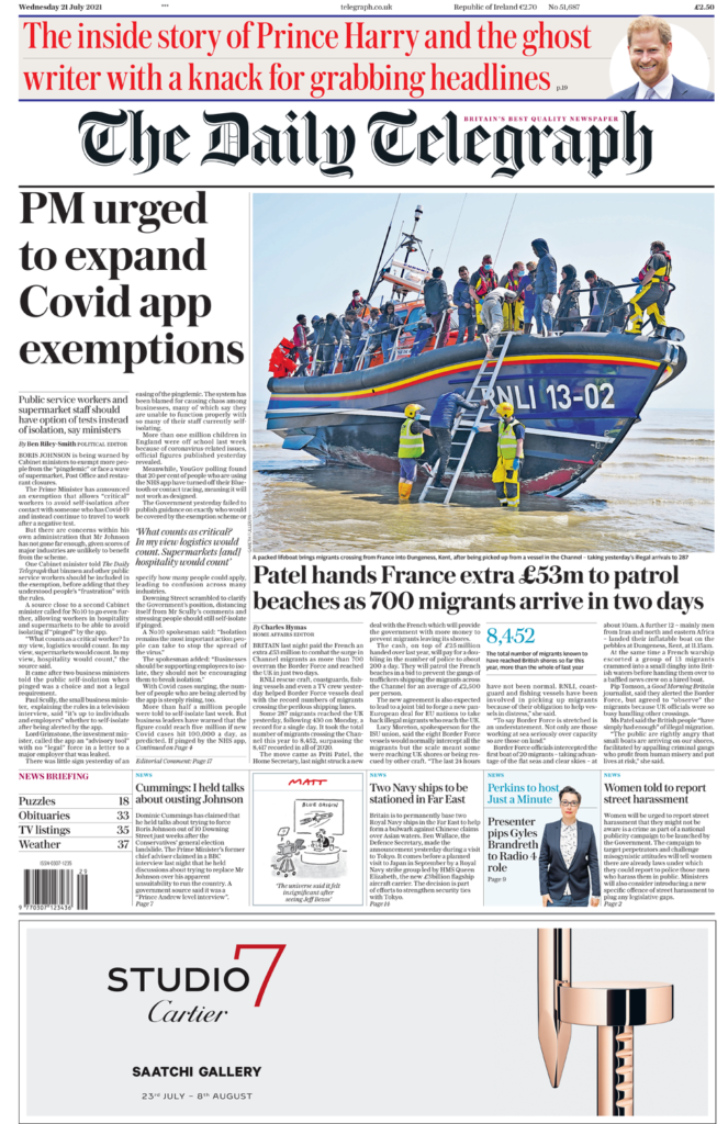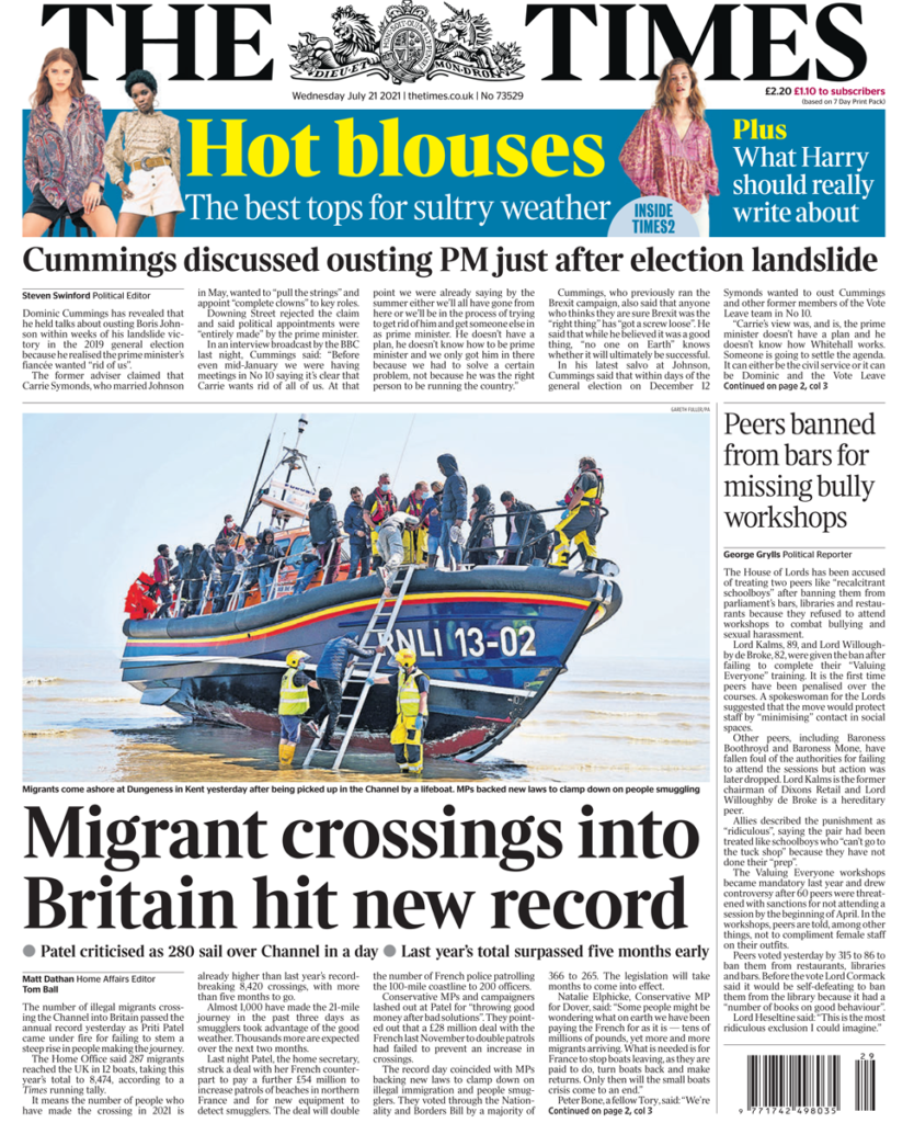 Οι Times στο πρωτοσέλιδό τους,επικεντρώνονται στον αριθμό των μεταναστών που διασχίζουν το Αγγλικό Κανάλι, αφού τουλάχιστον 430 άτομα πέρασαν τη Δευτέρα, αριθμός ρεκόρ για μία μέρα, σημειώνοντας ότι ο αριθμός των μεταναστών που διέρχονται έχει φτάσει σχεδόν τους 8.500, ξεπερνώντας, το συνολικό αριθμό του 2020. Οι Times γράφουν ότι περίπου 1.000 άτομα έχουν κάνει το ταξίδι των 21 μιλίων τις τελευταίες τρεις ημέρες, καθώς οι λαθρέμποροι εκμεταλλεύτηκαν τον καλό καιρό.