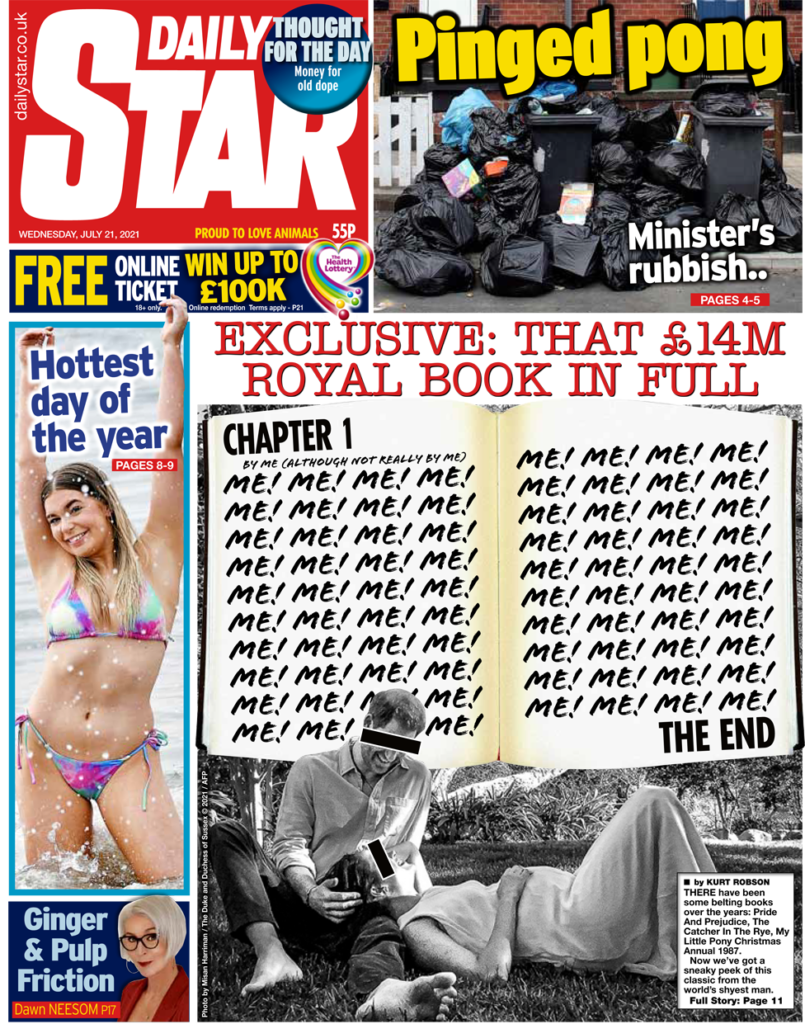 Τέλος, η Daily Star αστειεύεται, λέγοντας ότι ρίχνει μια «κλεφτή ματιά» στα απομνημόνευμα του Δούκα του Σάσεξ, τα οποία πρόκειται να δημοσιευθούν τον επόμενο χρόνο. Εδώ και αρκετούς μήνες η εφημερίδα κάνει αστεία για τον Πρίγκιπα Χάρι, τον οποίο αποκαλεί ως τον «πιο ντροπαλό άνθρωπο του κόσμου» λόγω των καταγγελιών του σχετικά με την επίθεση των ΜΜΕ. Σήμερα δεν υπάρχει διαφορετική προσέγγιση, καθώς όπως αποκλειστικά η εφημερίδα αποκαλύπτει, το μόνο περιεχόμενο του βιβλίου θα λέει: “Εγώ! Εγώ! Εγώ!”