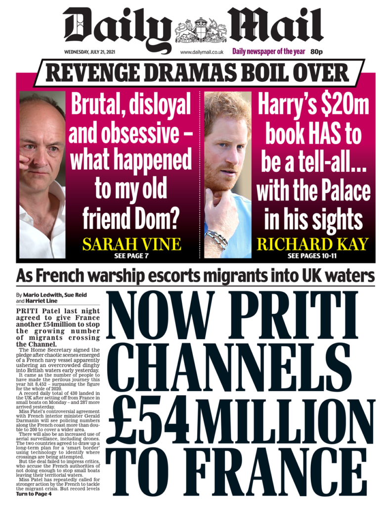 Η Daily Mail επικεντρώνεται στις προσπάθειες της κυβέρνησης, επισημαίνοντας ότι η υπουργός Εσωτερικών Priti Patel συμφώνησε να δώσει στη Γαλλία άλλα 54 εκατομμύρια λίρες με στόχο να εμποδίσει τους μετανάστες να διασχίσουν το αγγλικό κανάλι για να φτάσουν στη Βρετανία. Η εφημερίδα αναφέρει ότι η «αμφιλεγόμενη» συμφωνία θα δει τον αριθμό αστυνόμευσης κατά μήκος των γαλλικών ακτών να υπερδιπλασιάζεται, σε 200 άτομα.