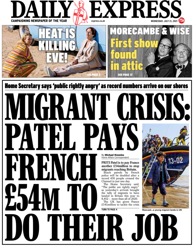“Η Patel πληρώνει στους Γάλλους 54 εκατομμύρια λίρες, για να κάνουν τη δουλειά της”, είναι ο τίτλος της Daily Express που κάνει λόγο για την πληρωμή προς τις γαλλικές αρχές.