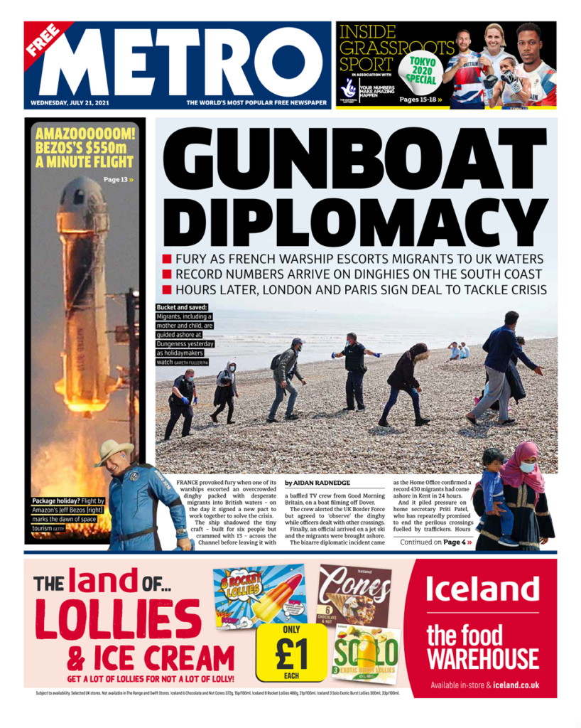 “Η διπλωματία των κανονιοφόρων” είναι ο τίτλος της Metro. Η εφημερίδα αναφέρει ότι η Γαλλία προκάλεσε «οργή» όταν ένα από τα πολεμικά της πλοία συνόδευσε μια υπερβολικά γεμάτη λέμβο στα βρετανικά ύδατα, ενώ την ίδια ημέρα υπέγραψε ένα νέο σύμφωνο με το Ηνωμένο Βασίλειο, για να συνεργαστούν για την επίλυση της κρίσης.