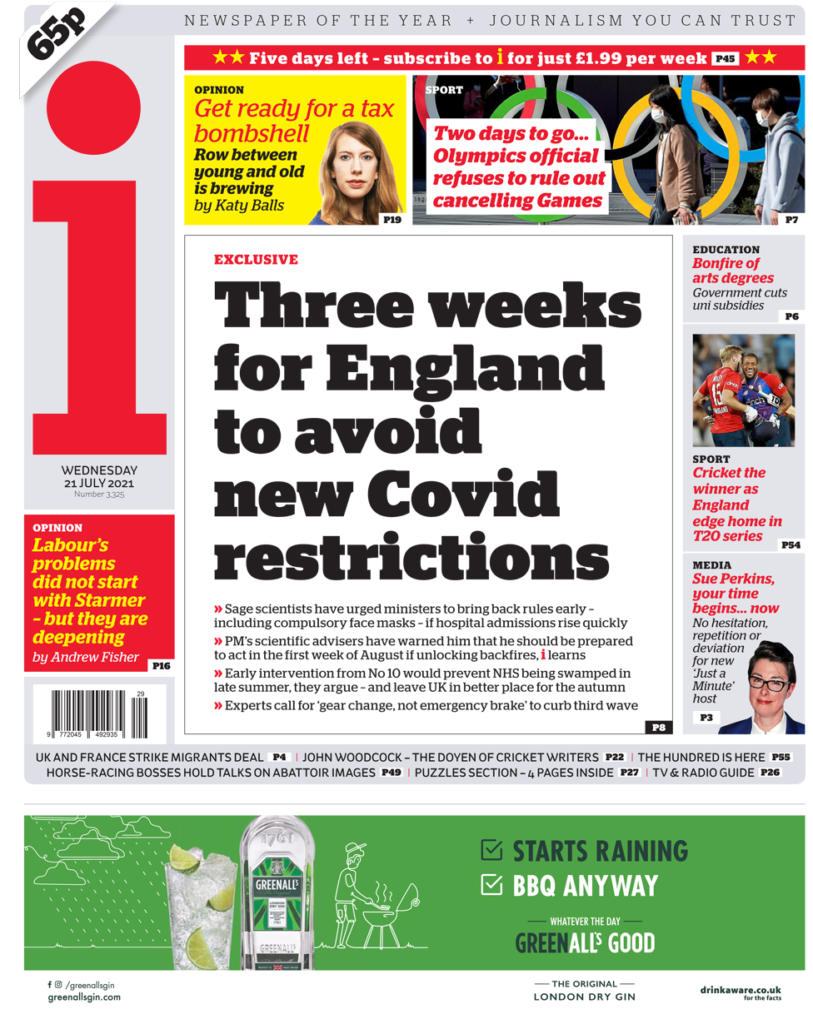Ο Covid παραμένει φυσικά στο επίκεντρο για πολλά άλλα πρωτοσέλιδα. Η εφημερίδα i αναφέρει ότι ο πρωθυπουργός έχει προειδοποιηθεί ότι πρέπει να είναι προετοιμασμένος να ενεργήσει την πρώτη εβδομάδα του Αυγούστου, εάν χαλαρώσουν οι περιορισμοί στην Αγγλία. Εμπειρογνώμονες της επιστημονικής συμβουλευτικής ομάδας για την αντιμετώπιση έκτακτων περιστατικών της κυβέρνησης προέτρεψαν τους υπουργούς να ανακαλέσουν κανόνες, συμπεριλαμβανομένης της υποχρεωτικής χρήσης μασκών, εάν οι εισαγωγές στα νοσοκομείο αυξηθούν γρήγορα, σύμφωνα με την εφημερίδα.