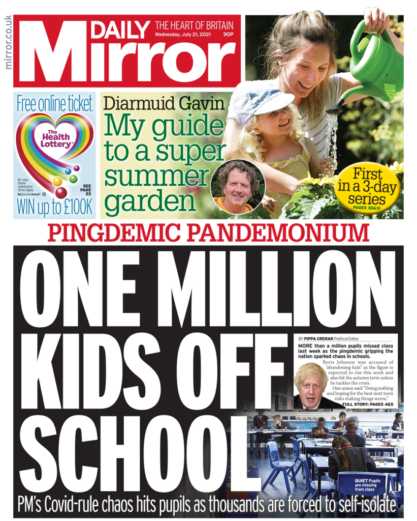 Η Daily Mirror εστιάζει στον αντίκτυπο των κανόνων αυτό-απομόνωσης στα παιδιά του σχολείου, αναφέροντας ότι περισσότεροι από ένα εκατομμύριο μαθητές έχασαν το σχολείο την περασμένη εβδομάδα. Η εφημερίδα επισημαίνει ότι ο αριθμός αναμένεται να αυξηθεί αυτή την εβδομάδα και επίσης θα επηρεάσει και τη φθινοπωρινή περίοδο, εκτός εάν ληφθούν μέτρα.