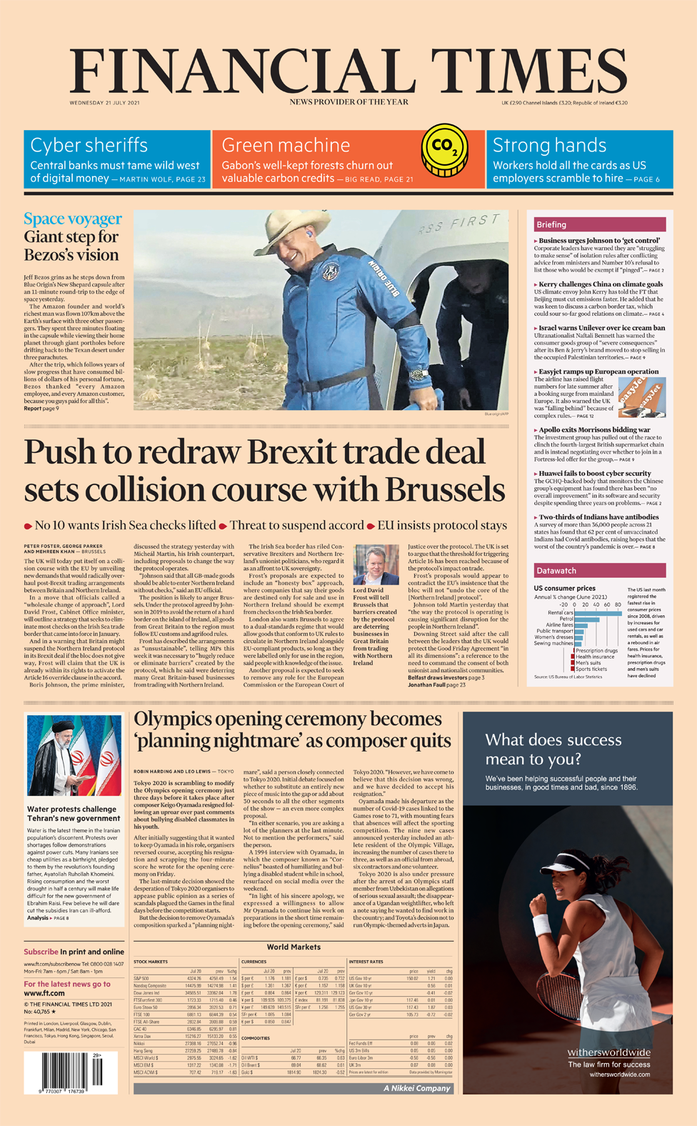 Οι Financial Times αναφέρουν ότι το Ηνωμένο Βασίλειο είναι έτοιμο να βάλει τον εαυτό του σε «πορεία σύγκρουσης» με την Ευρωπαϊκή Ένωση, αποκαλύπτοντας νέες απαιτήσεις που θα επιδιώκουν την εξάλειψη των περισσότερων ελέγχων στα εμπορικά σύνορα της Ιρλανδικής Θάλασσας, που σύμφωνα με την εφημερίδα θα «αναθεωρήσει ριζικά» τις συναλλαγές μετά το Brexit μεταξύ της Βρετανίας και της Βόρειας Ιρλανδίας. Ο υπουργός Λόρδος Frost θα περιγράψει μια στρατηγική που αποσκοπεί στην εξάλειψη των περισσότερων ελέγχων στα εμπορικά σύνορα της Ιρλανδικής Θάλασσας που τέθηκαν σε ισχύ τον Ιανουάριο, αναφέρουν οι Financial Times.