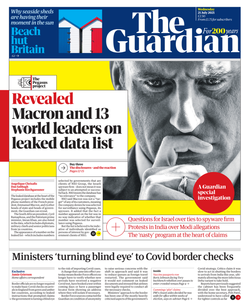 Η Guardian αναφέρεται στις αποκαλύψεις από την έρευνά του για το Pegasus, ένα λογισμικό κατασκοπείας που αναπτύχθηκε από την εταιρεία NSO. Η εφημερίδα αναφέρει ότι μια διαρροή βάσης δεδομένων περιλαμβάνει τους αριθμούς κινητής τηλεφωνίας του Γάλλου προέδρου Emmanuel Macron και 13 άλλων αρχηγών κρατών ή κυβερνήσεων. Η εμφάνιση ενός αριθμού στη λίστα δεν σημαίνει ότι υποβλήθηκε σε απόπειρα ή επιτυχημένη επίθεση και η NSO επιμένει ότι δεν έχει “σχέση” με την εταιρεία, προσθέτοντας ότι ο κ. Macron δεν ήταν «στόχος» κανενός από τους πελάτες του.