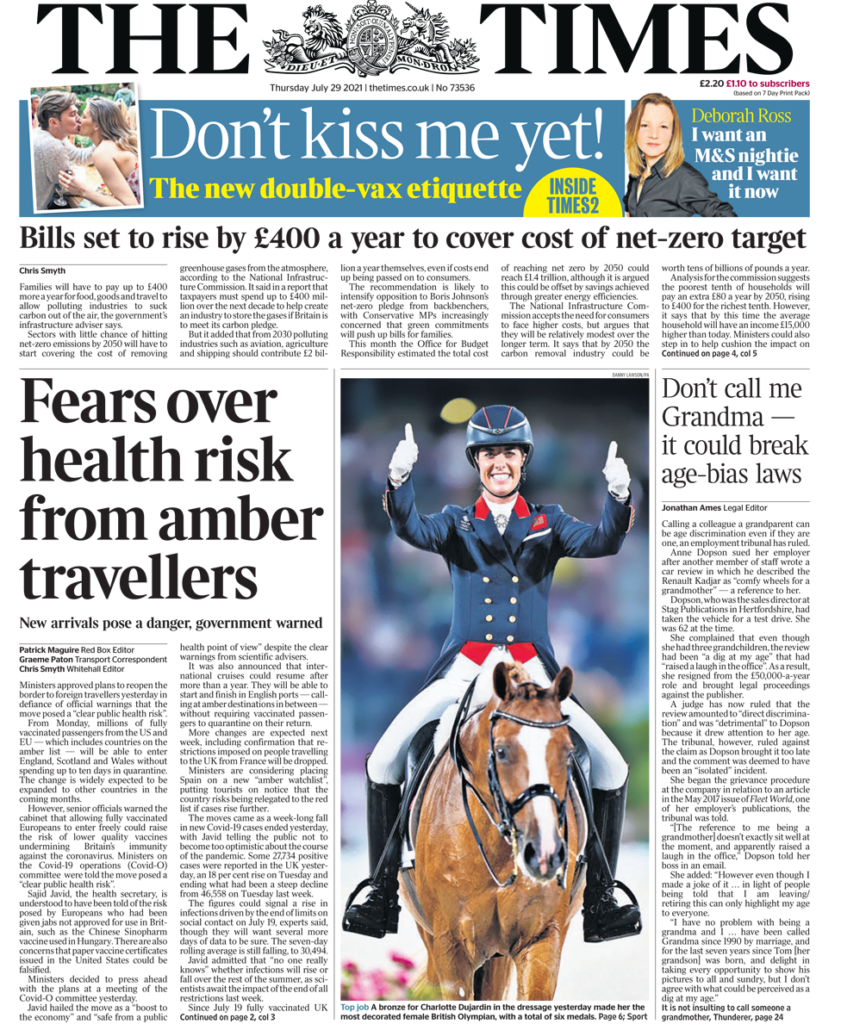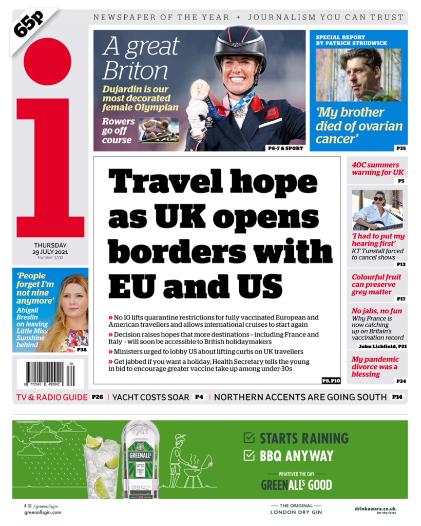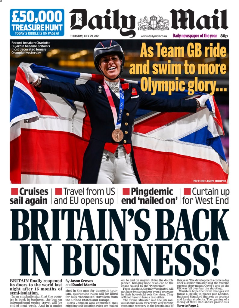 Με πολλές από τις εφημερίδες να καλύπτουν τη χαλάρωση των ταξιδιωτικών οδηγιών, ο τίτλος της Daily Mail είναι: “Η Βρετανία επέστρεψε στις επιχειρήσεις!”, καθώς οι κρουαζιέρες ξεκίνησαν ξανά, τα ταξίδια από την Ευρωπαϊκή Ένωση και τις ΗΠΑ αρχίζουν πάλι και το West End, το σημαντικότερο εμπορικό και ψυχαγωγικό κέντρο του Λονδίνου, πρόκειται να ανοίξει εκ νέου. Από τις 16 Αυγούστου οι πλήρως εμβολιασμένοι δεν θα χρειάζεται να μπουν σε καραντίνα ακόμη και αν κάποιος έρθει σε επαφή με τον ιό, ούτε θα πρέπει να κάνουν τεστ. Ο πρωθυπουργός είπε ότι το γεγονός θα πρέπει να επιτρέψει μια «πολύ, πολύ ισχυρή» οικονομική ανάκαμψη στο δεύτερο εξάμηνο του τρέχοντος έτους. Η εορταστική διάθεση ολοκληρώνεται με μια εικόνα της Ολυμπιονίκη αναβάτη, Charlotte Dujardin, να γιορτάζει το έκτο μετάλλιο της, τυλιγμένη με τη σημαία της Βρετανίας. Η Dujardin έκανε ρεκόρ χθες, αφού κερδίζοντας το έκτο μετάλλιο έγινε η πιο επιτυχημένη Βρετανίδα Ολυμπιονίκης στην ιστορία. Το προηγούμενο ρεκόρ με πέντε μετάλλια είχε αρχικά η τενίστρια Kitty Godfree στους Αγώνες του Παρισιού το 1924 και το είχε κρατήσει για σχεδόν 100 χρόνια.