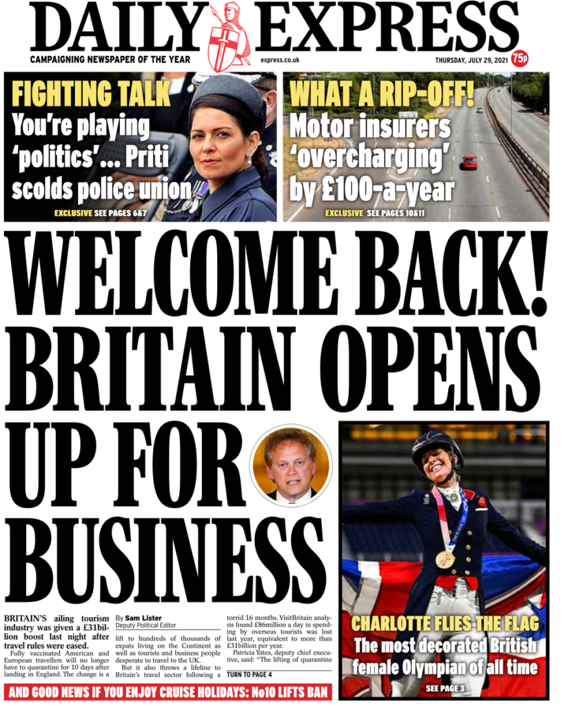 Η Daily Express με παρόμοιο ύφος, αναφωνεί: “Καλώς ήρθατε πίσω! Η Βρετανία ανοίγει για τις επιχειρήσεις”. Η εφημερίδα σημειώνει ότι η «πάσχουσα τουριστική βιομηχανία» ενισχύθηκε με 31 δισ. λίρες από τη χαλάρωση των ταξιδιωτικών οδηγιών για τους πλήρως εμβολιασμένους επισκέπτες από την Ευρωπαϊκή Ένωση και τις ΗΠΑ, οι οποίοι δεν θα χρειάζεται πλέον να μπουν σε καραντίνα για 10 ημέρες μετά την άφιξή τους στην Αγγλία. Η αλλαγή είναι μια ευχάριστη είδηση για εκατοντάδες χιλιάδες ομογενείς που ζουν στην ήπειρο, καθώς και για τουρίστες και επιχειρηματίες που θέλαν να ταξιδέψουν στο Ηνωμένο Βασίλειο. Η ανάλυση VisitBritain διαπίστωσε ότι 86 εκατομμύρια λίρες την ημέρα σε δαπάνες από ξένους τουρίστες χάθηκαν πέρυσι, ενώ είχε προβλέψει μια αργή ανάκαμψη, με δαπάνες επισκεπτών από το εξωτερικό στο Ηνωμένο Βασίλειο φέτος 6,2 δις. λιρών έναντι 28,4 δις. λιρών το 2019.