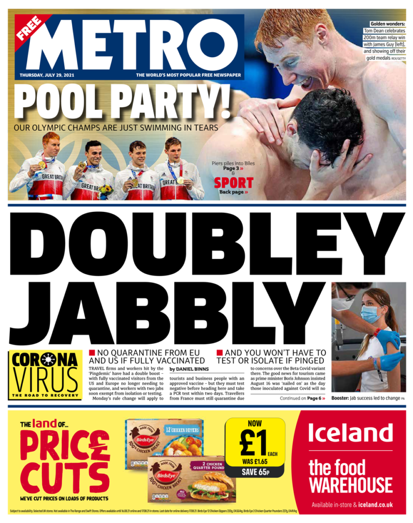 Ο τίτλος της Metro είναι «Διπλά εμβολιασμένοι» καθώς η εφημερίδα εξετάζει δύο οφέλη από τον πλήρη εμβολιασμό. Εκτός από τους ταξιδιώτες από την Ευρωπαϊκή Ένωση και τις ΗΠΑ που μπορούν να αποφύγουν την καραντίνα στη Βρετανία, η εφημερίδα γράφει ότι οι πλήρως εμβολιασμένοι εργαζόμενοι θα εξαιρούνται σύντομα από τις απαιτήσεις απομόνωσης ή των τεστ εάν έρθουν σε επαφή με ένα επιβεβαιωμένο κρούσμα Covid-19.
