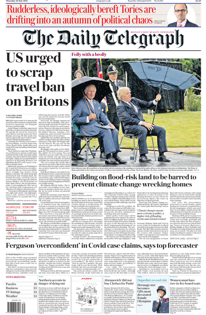 Η Daily Telegraph γράφει ότι ο υπουργός Μεταφορών Grant Shapps «αναμένει» πως οι ΗΠΑ θα καταργήσουν την απαγόρευση ταξιδιού για τους επισκέπτες του Ηνωμένου Βασιλείου, μετά τη χαλάρωση των ταξιδιωτικών οδηγιών της Βρετανίας, τονίζοντας ότι η διπλωματική πίεση συνεχίζει να εντείνεται, αλλά διευκρίνισε οι ελπίδες πως η Ουάσιγκτον και οι Βρυξέλλες θα άνοιγαν τα σύνορά τους ταυτόχρονα το βράδυ της Τρίτης, «φαίνεται ότι απέτυχαν».