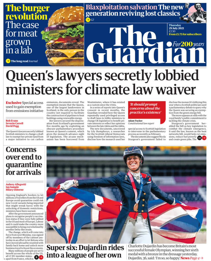 Η Guardian τονίζει επίσης τις ανησυχίες των Εργατικών για μια άλλη νέα μετάλλαξη του κορονοϊού που μπορεί να εισέλθει στη χώρα. Στο κύριο θέμα της γράφει ότι, οι δικηγόροι της βασίλισσας πίεσαν τους Σκωτσέζους υπουργούς να αλλάξουν σχέδιο νόμου για την εξαίρεση της ιδιωτικής της γης από μια σημαντική πρωτοβουλία για τη μείωση των εκπομπών άνθρακα, όπως αποκαλύπτουν έγγραφα. Η εξαίρεση σημαίνει ότι η βασίλισσα, ένας από τους μεγαλύτερους γαιοκτήμονες στη Σκωτία, είναι το μόνο άτομο στη χώρα που δεν απαιτείται να διευκολύνει την κατασκευή αγωγών για τη θέρμανση κτιρίων χρησιμοποιώντας ανανεώσιμες πηγές ενέργειας. Οι δικηγόροι της εξασφάλισαν την συμφωνία με την κυβέρνηση της Σκωτίας πριν από πέντε μήνες, εκμεταλλευόμενοι μια περίεργη κοινοβουλευτική διαδικασία, που υπήρχε ως έθιμο από το 1700, γνωστή ως συγκατάθεση της βασίλισσας, η οποία γνωστοποιεί στην μονάρχη εκ των προτέρων τη νομοθεσία. Η Guardian αποκάλυψε πως η βασίλισσα επανειλημμένα χρησιμοποίησε την προνομιακή πρόσβαση σε σχέδια νόμων για να πιέσει τους υπουργούς να αλλάξουν και τη νομοθεσία του Ηνωμένου Βασιλείου προς όφελος των ιδιωτικών της συμφερόντων.