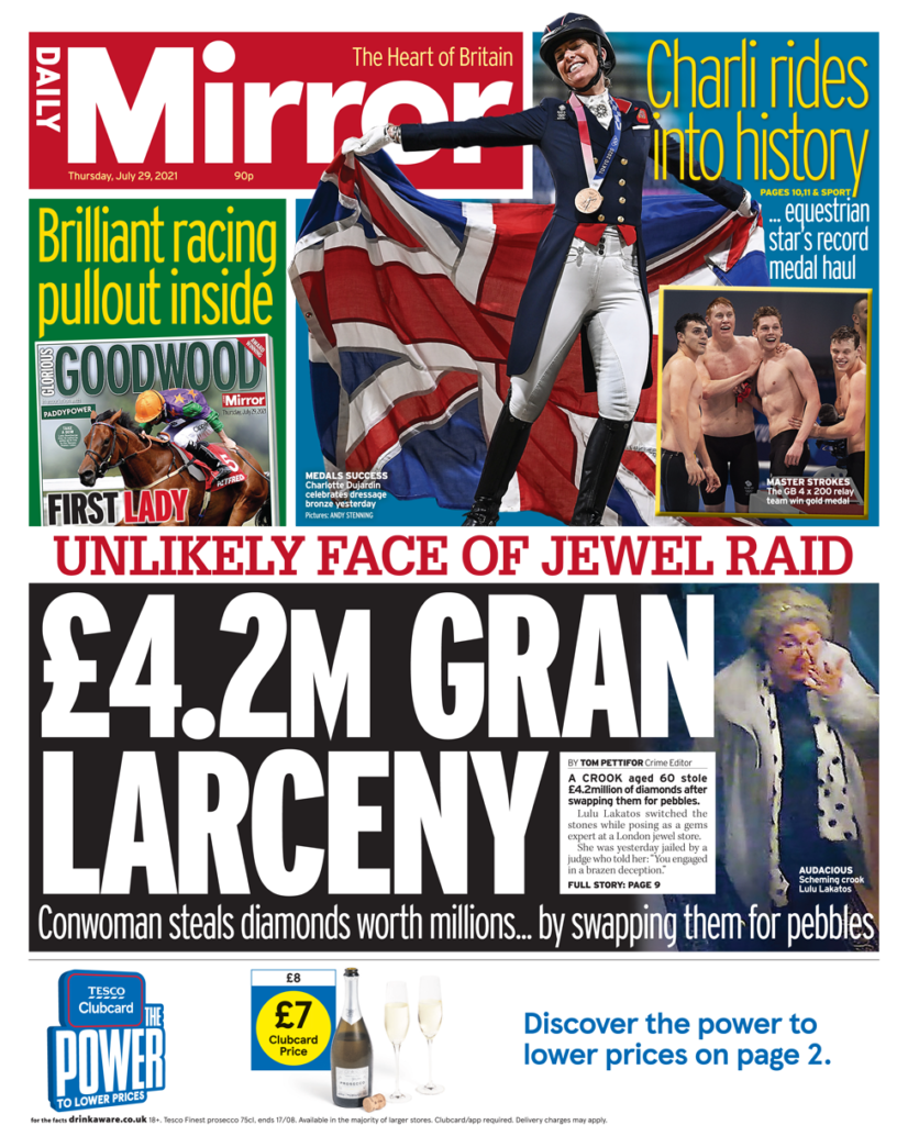 Μια εικόνα του “απίθανου” προσώπου μιας απάτης κοσμημάτων ύψους 4,2 εκ. £, στην οποία τα διαμάντια ανταλλάχθηκαν με άχρηστες πέτρες, έχει η Daily Mirror στο πρωτοσέλιδό της. Μια σεμνή γκριζομάλλα, γυναίκα που φοράει γυαλιά, είναι κατηγορούμενη για την “μεγάλη κλοπή”. Η απατεώνας Lulu Lakatos, ηλικίας 60 ετών, έκλεψε τα πολύτιμα διαμάντια, αξίας εκατομμυρίων αφού παρουσιάστηκε ως ειδικός πολύτιμων λίθων με το όνομα “Anna”, σε ένα κοσμηματοπωλείο στο Λονδίνο. Χθες καταδικάστηκε σε πεντέμισι χρόνια και φυλακίστηκε από δικαστή που της είπε: «Προέβης σε μια θρασύτατη εξαπάτηση».
