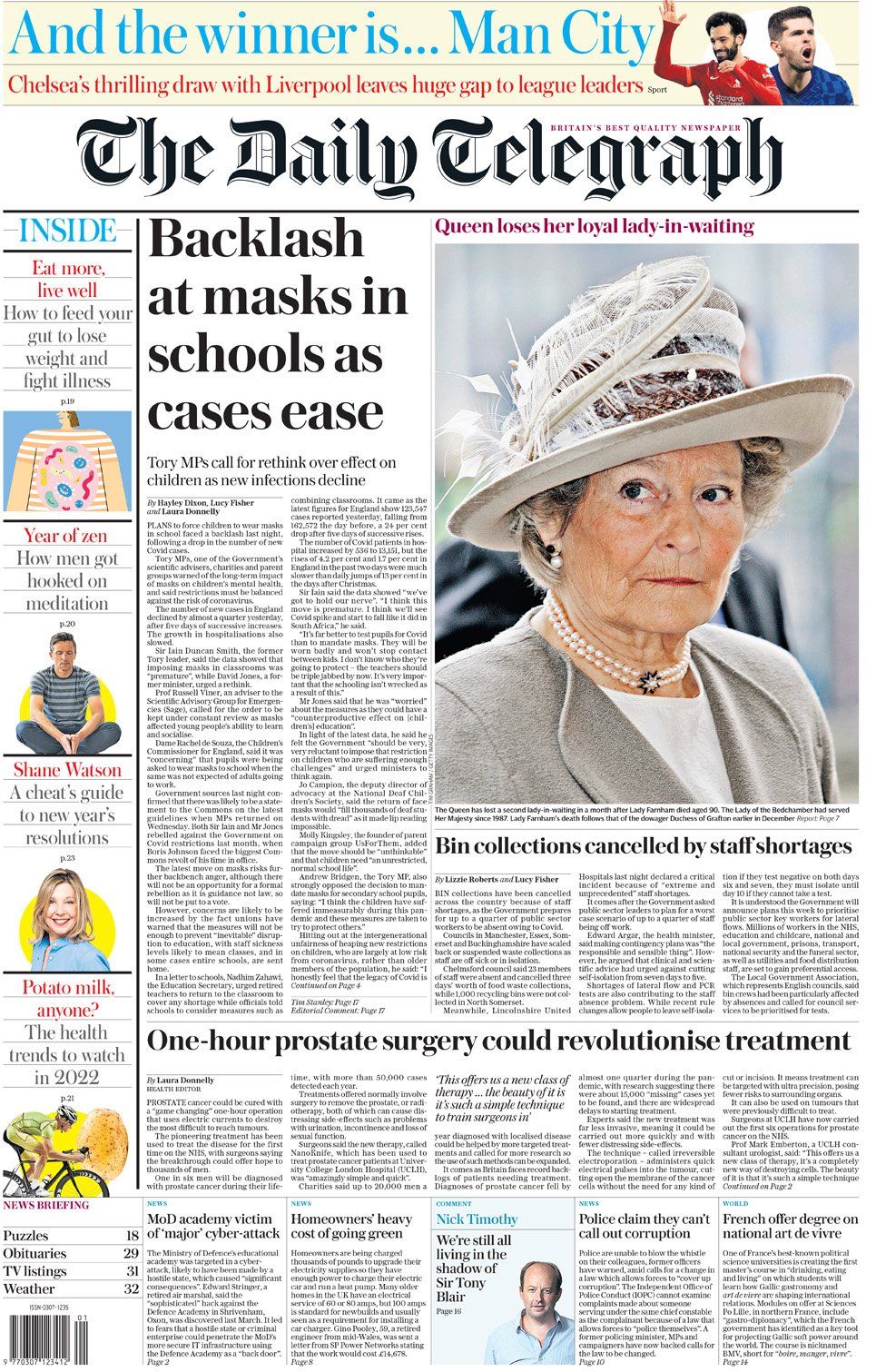 Σύμφωνα με την Daily Telegraph, τα σχέδια της κυβέρνησης να απαιτήσουν από τους μαθητές της δευτεροβάθμιας εκπαίδευσης στην Αγγλία να φορούν μάσκες στις τάξεις, αντιμετωπίστηκαν με «αντίδραση», δεδομένου ότι ο αριθμός των καθημερινών κρουσμάτων Covid μειώθηκε την Κυριακή στη χώρα και η αύξηση των εισαγωγών στα νοσοκομεία έχει επιβραδυνθεί. Η εφημερίδα προσθέτει ότι Συντηρητικοί βουλευτές, ένας από τους επιστημονικούς συμβούλους της κυβέρνησης, φιλανθρωπικές οργανώσεις και ομάδες γονέων έχουν προειδοποιήσει για τη μακροπρόθεσμη επίδραση των μασκών στην ψυχική υγεία των παιδιών. Ο πρώην αρχηγός των Tories, Sir Iain Duncan Smith, λέει στην εφημερίδα ότι τα τρέχοντα δεδομένα δείχνουν ότι πρέπει να «κρατήσουμε την ψυχραιμία μας» και ότι η επιβολή μασκών στις τάξεις είναι «πρόωρη». Ο πρώην συντηρητικός υπουργός David Jones, είπε επίσης ότι οι μάσκες θα μπορούσαν να έχουν αντιπαραγωγική επίδραση στην εκπαίδευση των παιδιών. Και τέλος, η Telegraph σημειώνει ότι ο καρκίνος του προστάτη θα μπορούσε να θεραπευτεί με μια επέμβαση διάρκειας μίας ώρας που «αλλάζει το παιχνίδι» καθώς χρησιμοποιεί ηλεκτρικό ρεύμα για να καταστρέψει τους πιο δύσκολους όγκους. Περισσότερα από 50.000 κρούσματα της νόσου ανιχνεύονται κάθε χρόνο, ενώ οι θεραπείες που προσφέρονται συνήθως περιλαμβάνουν χειρουργική επέμβαση για την αφαίρεση του προστάτη και ακτινοθεραπεία και με τα δύο να προκαλούν δυσάρεστες παρενέργειες. Η εφημερίδα επισημαίνει ότι η νέα θεραπεία, που προσφέρεται στο NHS για πρώτη φορά, πραγματοποιείται πολύ πιο γρήγορα και λιγότερο επεμβατικά.