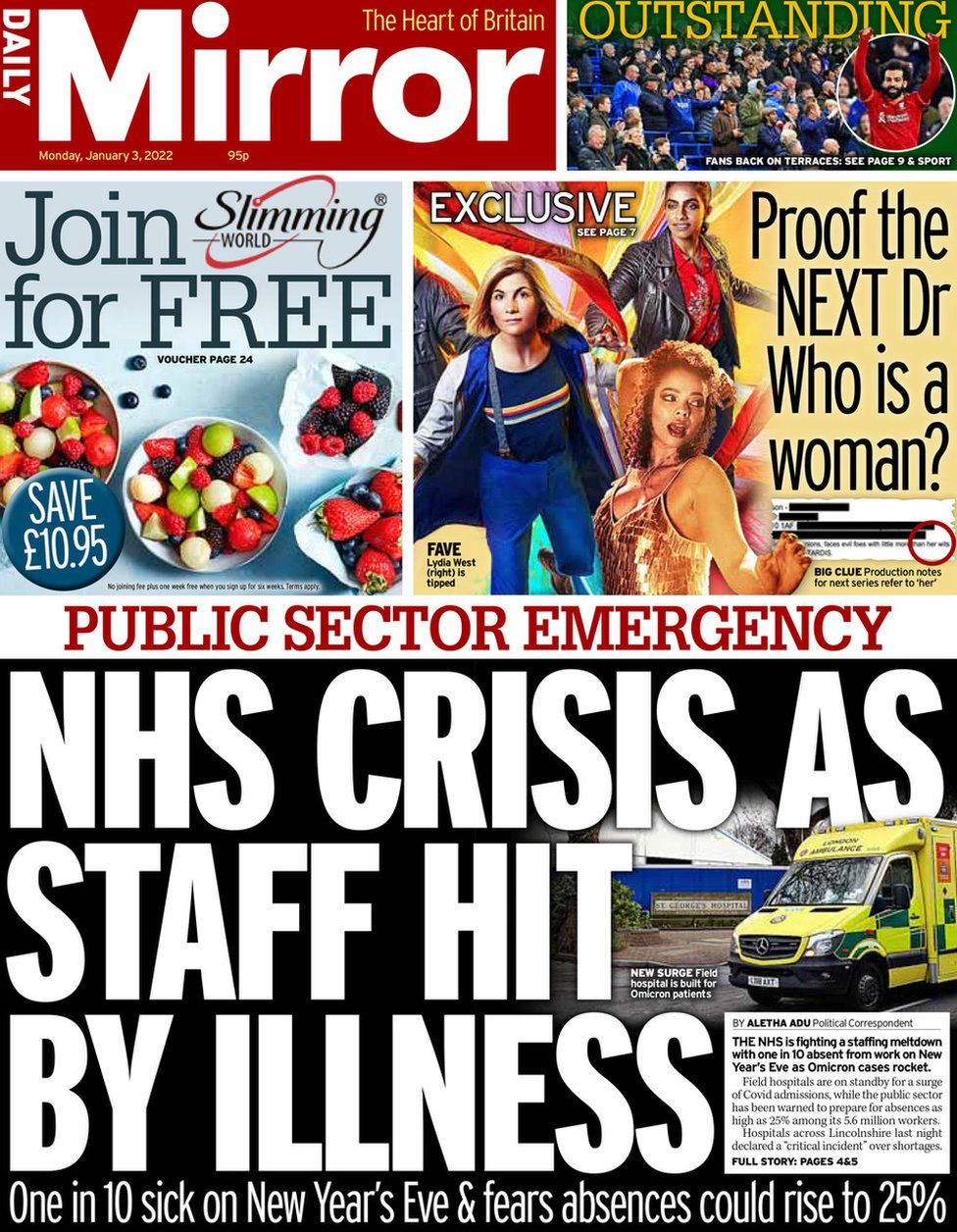 Με έναν στους 10 υπαλλήλους του NHS να απουσιάζει από την εργασία του την παραμονή της Πρωτοχρονιάς, με 50.000 από αυτούς στο σπίτι είτε άρρωστους με Covid είτε απομονωμένους σε καραντίνα, εν μέσω αυξανόμενων κρουσμάτων της Omicron, η Daily Mirror προειδοποιεί ότι η υπηρεσία υγείας παλεύει με μια «κατάρρευση του προσωπικού». Η εφημερίδα αναφέρει ότι είναι μέρος της έκτακτης ανάγκης που αντιμετωπίζει ο δημόσιος τομέας, ο οποίος έχει προειδοποιηθεί να προετοιμαστεί ότι το 25% του εργατικού δυναμικού θα είναι εκτός και θα μπορούσαν να αφήσουν έως και 1,4 εκατομμύρια από το προσωπικό του NHS εκτός. Οι υπουργοί προσπαθούν τώρα να καταρτίσουν σχέδια έκτακτης ανάγκης για τη μείωση της αναστάτωσης στα νοσοκομεία, τα σχολεία, τον τομέα του τουρισμού και την κοινωνική περίθαλψη. Νοσοκομεία σε όλο το Lincolnshire χθες το βράδυ κήρυξαν «έκτακτη ανάγκη» λόγω «ακραίων και πρωτοφανών» ελλείψεων προσωπικού. Το NHS δημιουργεί «κόμβους έξαρσης» του Covid σε νοσοκομεία σε όλη την Αγγλία, συμπεριλαμβανομένου του St George’s στο Tooting, στο Νότιο Λονδίνο, καθώς οι εισαγωγές κορωνοϊού στην Αγγλία έφτασαν στο υψηλότερο επίπεδο ενός έτους.
