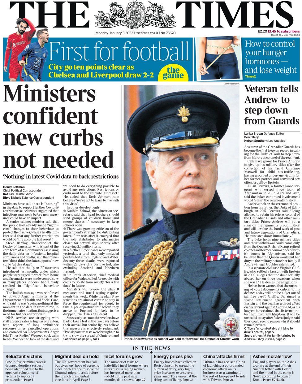Ωστόσο, οι Times αποκαλύπτουν ότι οι υπουργοί είναι «βέβαιοι» ότι δεν υπάρχει τίποτα στα δεδομένα που να δικαιολογεί την εισαγωγή περαιτέρω περιορισμών στην Αγγλία, επικαλούμενοι σχόλια των Steve Barclay και Edward Argar την Κυριακή. Εν όψει της κυβερνητικής ανακοίνωσης αυτής της εβδομάδας για τα μέτρα του Σχεδίου Β της Αγγλίας και τις απαιτήσεις ταξιδιωτικών δοκιμών, η εφημερίδα επισημαίνει ότι οι περιορισμοί του Σχεδίου Β είναι “σχεδόν βέβαιο” ότι θα παραμείνουν, αλλά ο κανόνας που απαιτεί από τους ανθρώπους να κάνουν τεστ Covid πριν από την αναχώρηση τους, πριν φτάσουν στην Αγγλία είναι «πιθανόν» να απορριφθεί. Οι Times μίλησαν με έναν βετεράνο των Φρουρών των Γρεναδιέρων, τον Julian Perreira, που καλεί τον Πρίγκιπα Άντριου να παραιτηθεί από τον ρόλο του ως συνταγματάρχης του σώματος. Ο Δούκας της Υόρκης, ο οποίος αρνείται οποιαδήποτε αδικοπραγία, αντιμετωπίζει εκκλήσεις να παραιτηθεί από τους στρατιωτικούς του τίτλους μετά την καταδίκη της Ghislaine Maxwell για σεξουαλική διακίνηση παιδιών. Ο Perreira, πρώην λοχίας που υπηρετούσε στο Αφγανιστάν, είπε ότι η συνεχιζόμενη ανάμειξη του Δούκα με την πολύκροτη υπόθεση, θα «αμαυρώσει» την ιστορία του συντάγματος των Γρεναδιέρων.