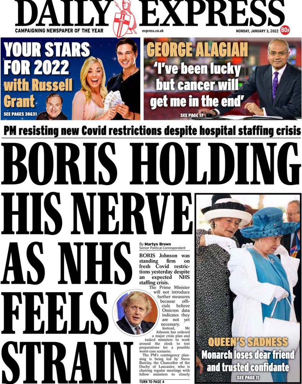 Η Daily Express γράφει ότι τα σχολεία της δευτεροβάθμιας εκπαίδευσης έχουν επίσης οδηγίες να εντείνουν τις δοκιμές, με όλους τους μαθητές να κάνουν τεστ πλευρικής ροής στο σχολείο πριν επανέλθουν στα μαθήματα μετά το διάλειμμα των Χριστουγέννων, καθώς και να συνεχίσουν να κάνουν τεστ δύο φορές την εβδομάδα. Σε παρόμοιο πνεύμα με πολλές άλλες, η εφημερίδα αναφέρει ότι ο πρωθυπουργός «κρατά την ψυχραιμία του» και δεν θα φέρει περαιτέρω περιορισμούς στην Αγγλία, καθώς αξιωματούχοι πιστεύουν ότι τα στοιχεία της Omicron δείχνουν ότι δεν είναι ακόμη απαραίτητοι. Ωστόσο, εν μέσω της «αναμενόμενης κρίσης προσωπικού του NHS», η εφημερίδα προσθέτει ότι ο κ. Τζόνσον διέταξε ένα «έκτακτο σχέδιο αντιμετώπισης κρίσης» που θα αναγκάσει τους υπουργούς «να εργάζονται όλο το εικοσιτετράωρο για να προετοιμαστούν για το χειρότερο δυνατό σενάριο», το οποίο θα μπορούσε να περιλαμβάνει την απουσία του 25% των 5,6 εκατομμυρίων από το εργατικό δυναμικό του δημόσιου τομέα.