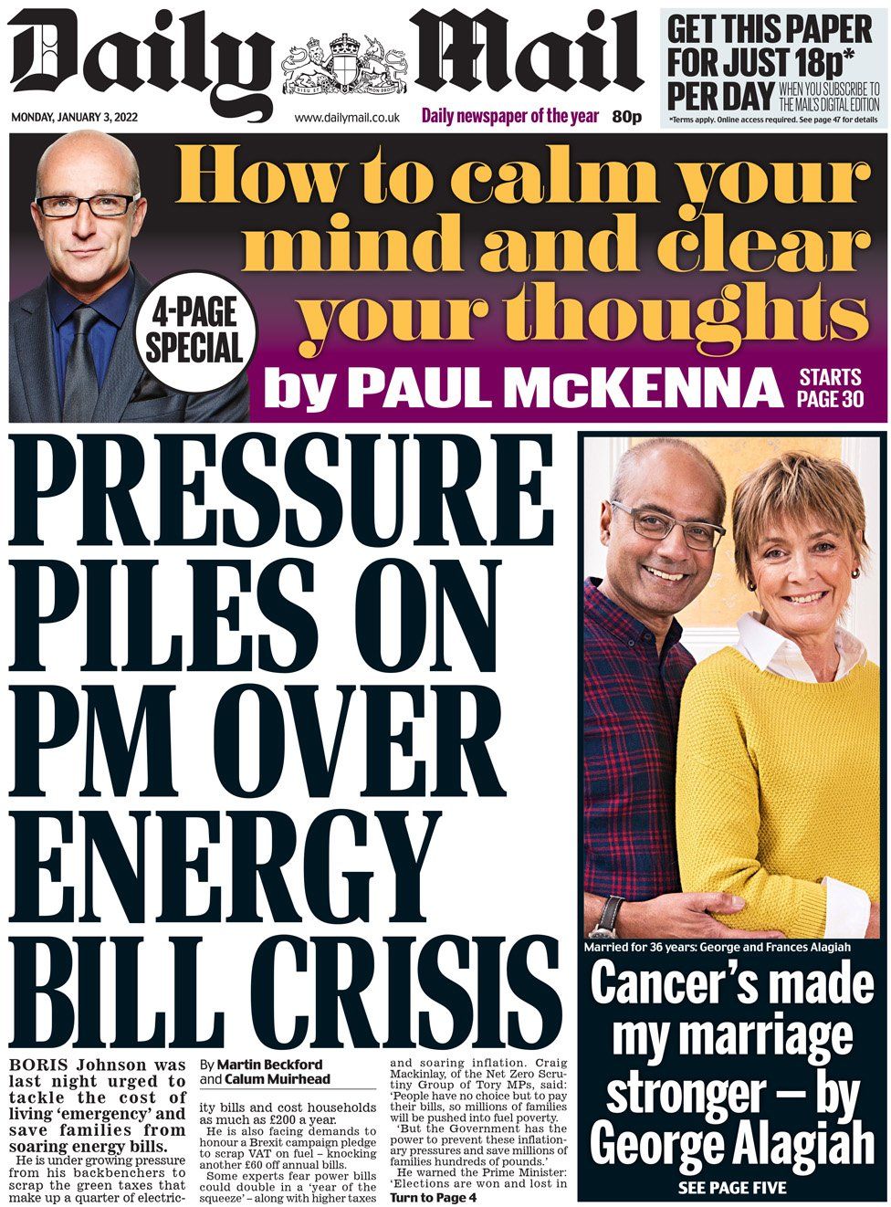 Η Daily Mail αναφέρεται σε ένα άλλο θέμα, την «αυξημένη πίεση» στον κ. Τζόνσον για τις «τεράστιες αυξήσεις» των λογαριασμών ενέργειας, τονίζοντας ότι οι υποστηρικτές θέλουν ο πρωθυπουργός να καταργήσει τους πράσινους φόρους που αντιστοιχούν στο ένα τέταρτο των λογαριασμών ηλεκτρικής ενέργειας και κοστίζουν στις οικογένειες έως και 200 λίρες ετησίως. Το κόστος χονδρικής έχει εκτοξευθεί λόγω της υψηλότερης ζήτησης από την Κίνα και των χαμηλότερων προμηθειών φυσικού αερίου. Η Βρετανία επλήγη περισσότερο από πολλές άλλες χώρες επειδή είναι ένας από τους μεγαλύτερους χρήστες φυσικού αερίου στην Ευρώπη, ενώ έχει επίσης μικρότερη δυνατότητα αποθήκευσης. Το ανώτατο όριο της τιμής της ενέργειας, το οποίο ορίζει τη μέγιστη χρέωση για 15 εκατομμύρια πελάτες σε τυπικά μεταβλητά τιμολόγια, πρόκειται να αυξηθεί ξανά τον Απρίλιο μετά από μια αύξηση 139 λιρών τον Οκτώβριο που οδήγησε τους ετήσιους λογαριασμούς στο ρεκόρ των 1.277 £. Το ανώτατο όριο του Απριλίου θα ανακοινωθεί από τη ρυθμιστική αρχή Ofgem τον επόμενο μήνα και οι ειδικοί πιστεύουν ότι θα μπορούσε να φτάσει σχεδόν τις 2.000 £ ετησίως.