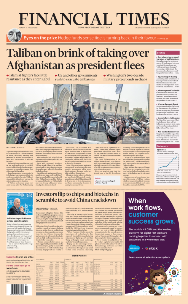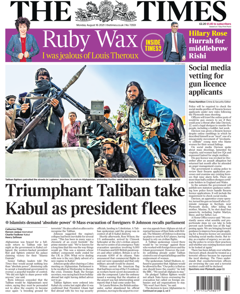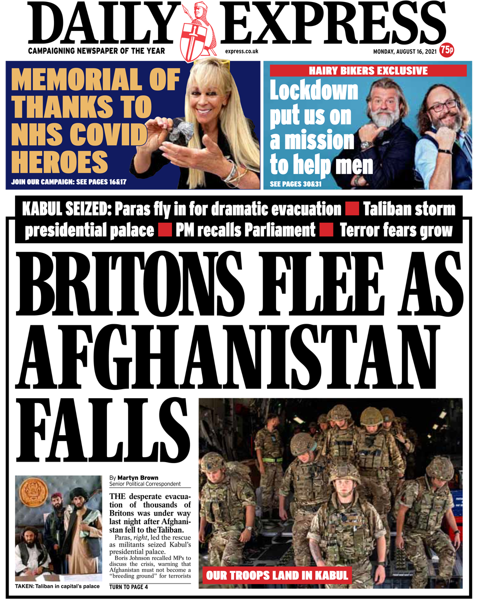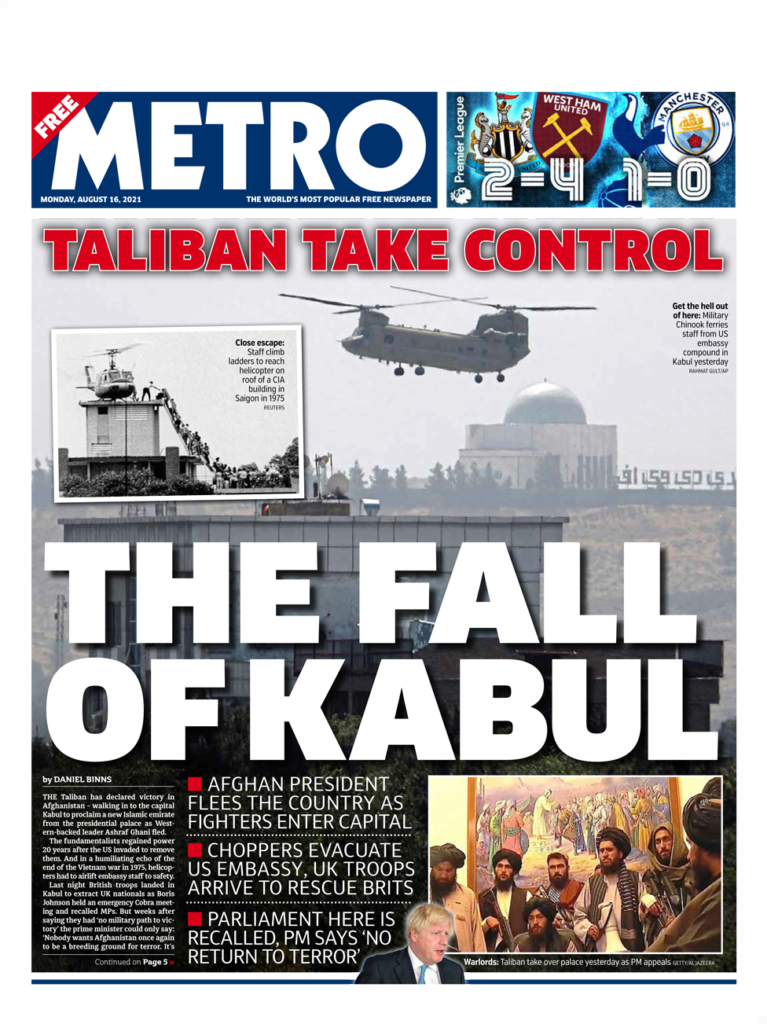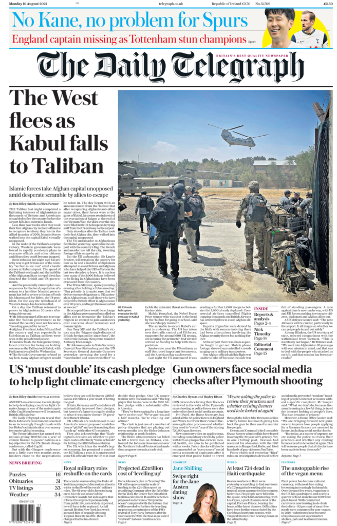 Η πτώση της Καμπούλ κυριαρχεί στα πρωτοσέλιδα, με τα περισσότερα να παρουσιάζουν εικόνες Ταλιμπάν μαχητών στο προεδρικό μέγαρο και στρατιωτικά ελικόπτερα να μεταφέρουν τους Δυτικούς σε ασφαλές σημείο, καθώς κατέρρευσε η κυβέρνηση της χώρας. Η Daily Telegraph γράφει ότι οι Ταλιμπάν ολοκλήρωσαν μια «αστραπιαία κατάληψη» του Αφγανιστάν σε λιγότερο από δύο εβδομάδες μετά την κατάληψη της πρώτης πόλης, σε μια επίθεση για την ανακατάληψη εδαφών που χάθηκαν κατά την εισβολή των Συμμάχων το 2001. Η Daily Telegraph αναφέρει ότι η «απελπισμένη προσπάθεια» για απόδραση έφερε «χαοτικές» σκηνές στο αεροδρόμιο της Καμπούλ, με τις βρετανικές και αμερικανικές κυβερνήσεις να «σοκάρονται» από την ταχύτητα της προέλασης των Ταλιμπάν, καθώς και την αδυναμία του Αφγανικού στρατού να τους αποκρούσει.
