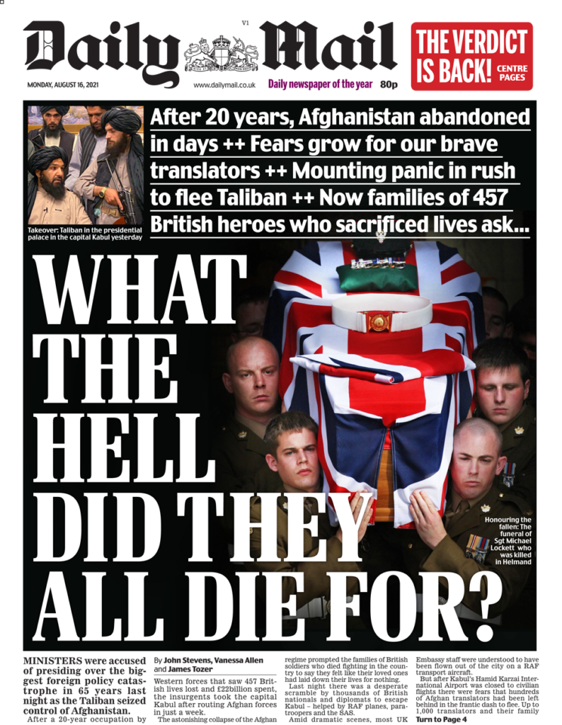 Μια φωτογραφία των Βρετανών στρατιωτών που κουβαλούσαν το φέρετρο του υπολοχαγού Μάικλ Λόκετ, ο οποίος σκοτώθηκε στο Χέρμαντ, δημοσιεύεται στο πρωτοσέλιδο της Daily Mail, μαζί με την ερώτηση: “Γιατί στο διάολο πέθαναν όλοι;” Η εφημερίδα είναι καυστική στην εκτίμησή της για την 20ετή κατοχή του Αφγανιστάν από τη Δύση και σημειώνει ότι 457 Βρετανοί έχασαν τη ζωή τους κατά τη διάρκεια αυτής της περιόδου στην χώρα. Αναφέρει ότι οι υπουργοί κατηγορούνται ότι προήδρευαν της περισσότερο καταστροφικής εξωτερικής πολιτικής τα τελευταία 65 χρόνια.