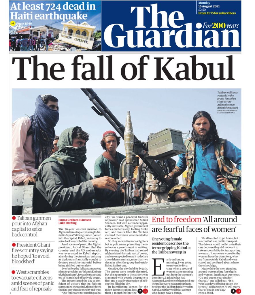 Η Guardian επισημαίνει ότι η 20χρονη αποστολή της Δύσης στο Αφγανιστάν κατέρρευσε σε μια δραματική μέρα. Εν μέσω σκηνών πανικού, ο Αφγανός πρόεδρος, Ασράφ Γκανί, εγκατέλειψε τη χώρα και ο πρέσβης των ΗΠΑ μεταφέρθηκε στο αεροδρόμιο της Καμπούλ, εγκαταλείποντας την αμερικανική πρεσβεία. Σύμφωνα με τον Guardian, οι Ταλιμπάν εισήλθαν στην Καμπούλ «όχι ως μαχητές, αλλά ως αστυνομικοί», αφού ξέσπασαν λεηλασίες όταν η παράδοση των κυβερνητικών δυνάμεων φαινόταν αναπόφευκτη. Αναφέρει επίσης ότι υπήρξε «οργή» στην πρωτεύουσα για την απόφαση του προέδρου Ασράφ Γκάνι να διαφύγει στο Ουζμπεκιστάν, μόλις μια μέρα αφότου εμφανίστηκε στην τηλεόραση και υποσχέθηκε να αναδιοργανώσει τον στρατό.