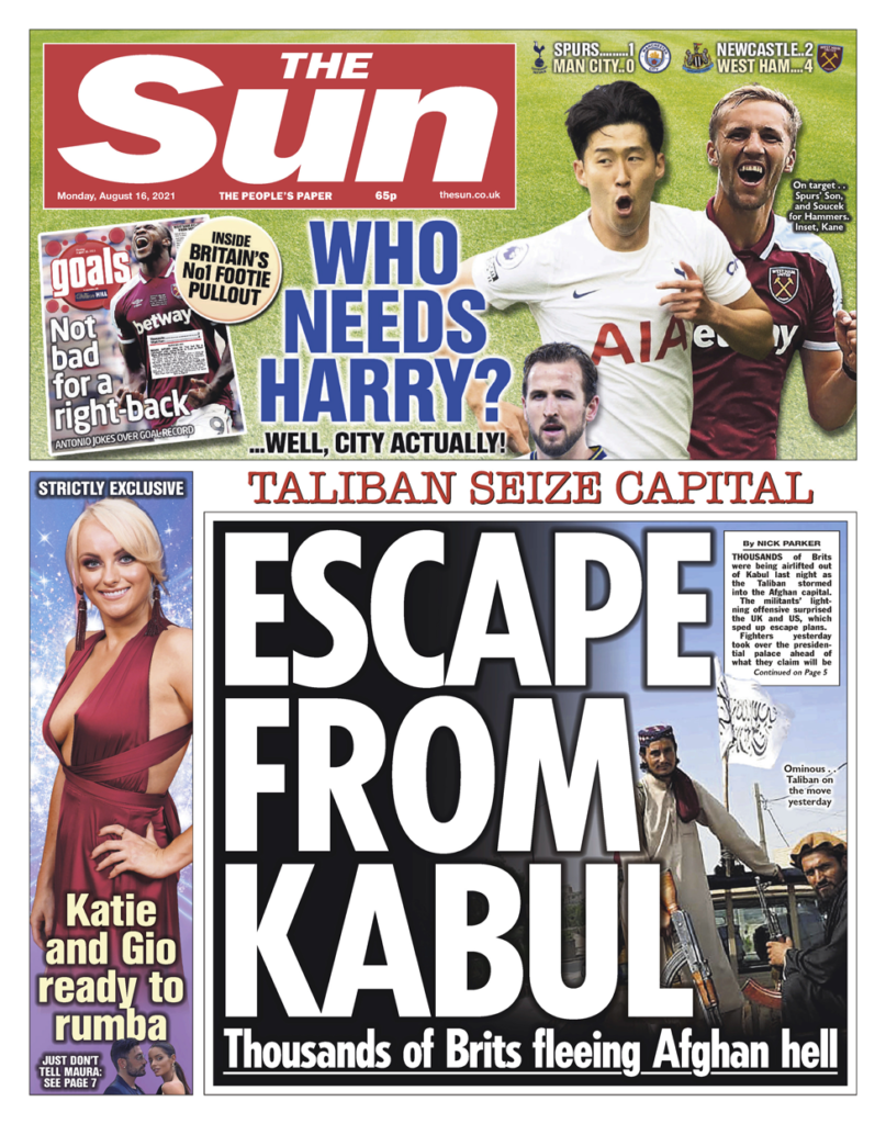 «Escape from Kabul» είναι ο τίτλος της Sun. Η εφημερίδα αναφέρει ότι χιλιάδες Βρετανοί μεταφέρθηκαν αεροπορικώς από την πρωτεύουσα το βράδυ της Κυριακής αφού το Ηνωμένο Βασίλειο και οι ΗΠΑ επιτάχυναν τα σχέδιά τους για απόδραση. Η Sun πιστεύει ότι η αποχώρηση από την Καμπούλ είναι “ντροπή”, υποστηρίζοντας ότι οι αμερικανικές υπηρεσίες πληροφοριών διέπραξαν “μνημειώδες λάθος”, αποτυγχάνοντας να συνειδητοποιήσουν ότι οι αφγανικές πόλεις θα έπεφταν τόσο γρήγορα.
