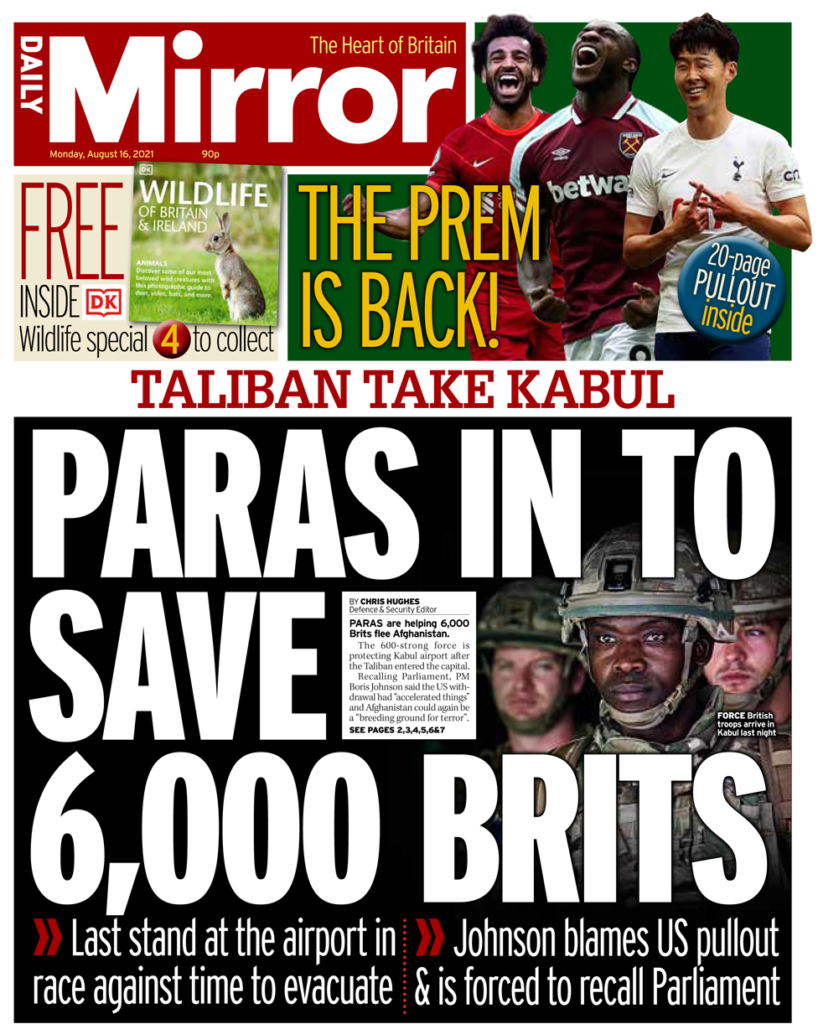 Η Daily Mirror γράφει ότι η δύναμη των 600 ανδρών βοηθά 6.000 Βρετανούς να φύγουν. Η εφημερίδα επικαλείται τον Τζόνσον ότι η αποχώρηση των αμερικανικών στρατευμάτων έχει «επιταχύνει τα πράγματα». Η Daily Mirror κατηγορεί τη Downing Street ότι «κοιμάται για άλλη μια φορά», υποστηρίζοντας ότι ο τρόπος που έπρεπε ο υπουργός Εξωτερικών Dominic Raab να «επιστρέψει γρήγορα» στο Ηνωμένο Βασίλειο από τις διακοπές είναι «συμβολικός» για το πόσο η Βρετανία και οι ΗΠΑ υποτίμησαν τους Ταλιμπάν.