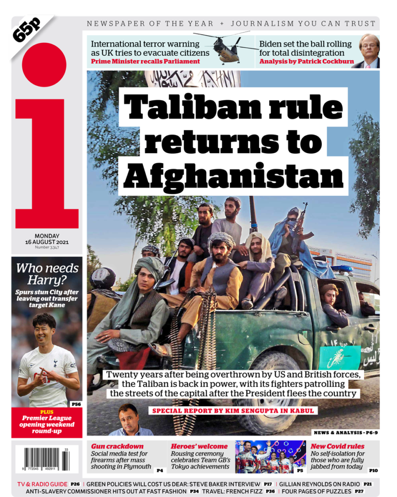 Η εφημερίδα i δημοσιεύει μια φωτογραφία των μελών της μαχητικής ομάδας στην πρώτη σελίδα του, με τον τίτλο “Ο νόμος των Ταλιμπάν επιστρέφει στο Αφγανιστάν”. Η εφημερίδα σημειώνει ότι αν και ήταν ο πρώην πρόεδρος των ΗΠΑ Ντόναλντ Τραμπ που ανακοίνωσε ότι η Αμερική θα αποχωρήσει από το Αφγανιστάν, το να προχωρήσει σε αυτήν την κίνηση ήταν η επιλογή του διαδόχου του Τζο Μπάιντεν. Η εφημερίδα περιγράφει την κίνηση ως «λάθος υπολογισμό» που θα «στοιχειώσει την υπόλοιπη προεδρία του».