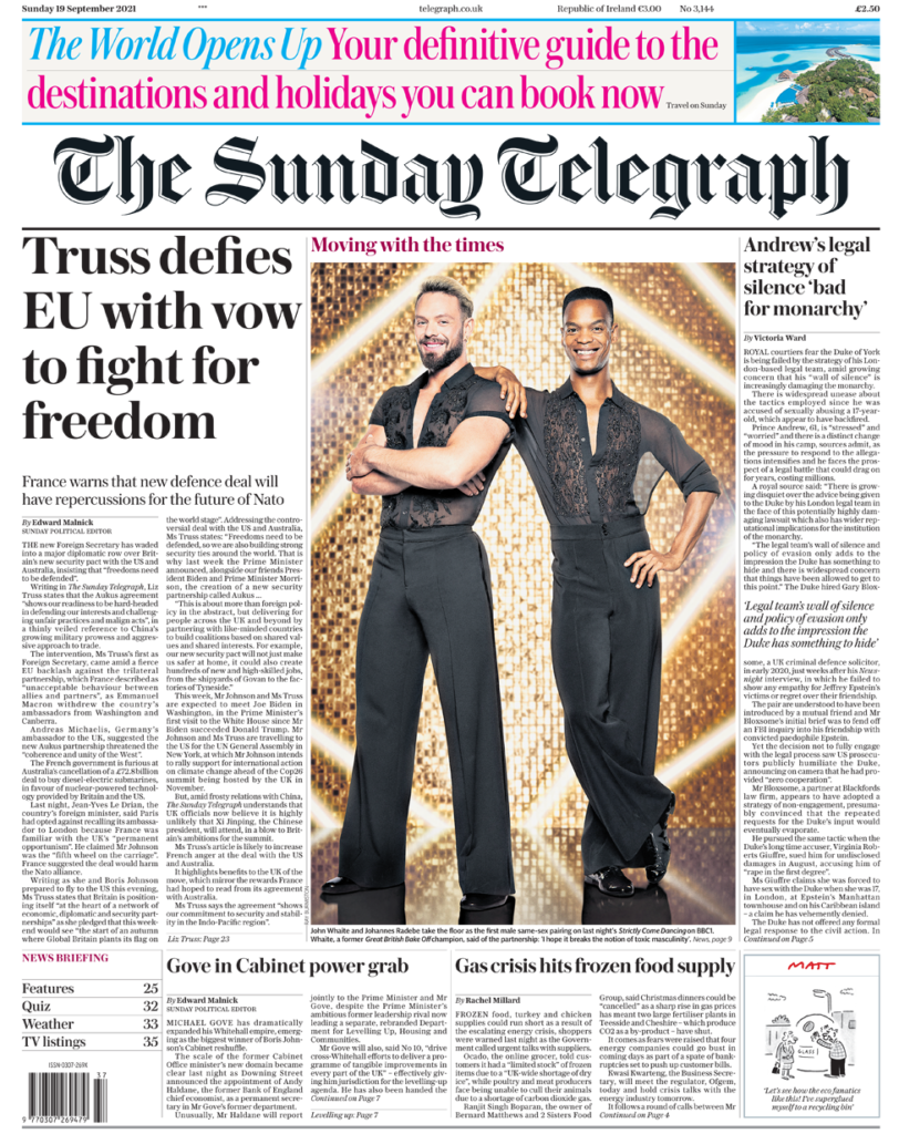 Η νέα υπουργός Εξωτερικών Liz Truss, «μπήκε σε μεγάλη διπλωματική διαμάχη» για το νέο σύμφωνο ασφαλείας του Ηνωμένου Βασιλείου με τις ΗΠΑ και την Αυστραλία, επιμένοντας ότι «οι ελευθερίες πρέπει να υπερασπιστούν», αναφέρει η Sunday Telegraph. Τα σχόλιά της στην εφημερίδα ακολουθούν την «άγρια» αντίδραση της Ευρωπαϊκής Ένωσης στη συμφωνία, την οποία η Γαλλία χαρακτήρισε «απαράδεκτη συμπεριφορά μεταξύ συμμάχων και εταίρων». Η συμμαχία, γνωστή ως Aukus, δίνει τη δυνατότητα στην Αυστραλία να αποκτήσει πυρηνικά υποβρύχια, αποτρέποντας μια συμφωνία πολλών δισεκατομμυρίων δολαρίων που είχε υπογράψει προηγουμένως η Γαλλία με τη χώρα.