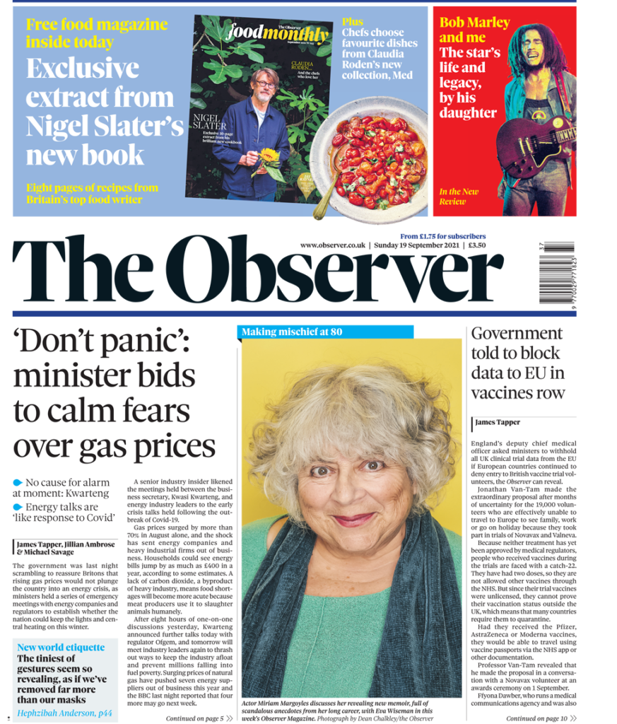 Ο Observer γράφει ότι οι υπουργοί πραγματοποιούν μια σειρά έκτακτων συνεδριάσεων με εταιρείες ενέργειας και ρυθμιστικές αρχές για να διαπιστώσουν εάν το Ηνωμένο Βασίλειο θα είναι σε θέση να διατηρήσει την ηλεκτροδότηση και την κεντρική θέρμανση αυτό το χειμώνα λόγω της αύξησης των τιμών του φυσικού αερίου. Η εφημερίδα σημειώνει ότι ένας ειδικός της βιομηχανίας παρομοίασε τις συναντήσεις για τις πρώτες συνομιλίες για την κρίση που πραγματοποιήθηκαν μετά το ξέσπασμα της πανδημίας. Ο Observer αναφέρει επίσης σε άλλο άρθρο του, ότι ο αναπληρωτής ιατρικός διευθυντής της Αγγλίας, καθηγητής Jonathan Van-Tam, ζήτησε από τους υπουργούς να αποκρύψουν όλα τα δεδομένα των κλινικών δοκιμών του Ηνωμένου Βασιλείου από την Ευρωπαϊκή Ένωση, εάν οι ευρωπαϊκές χώρες συνεχίσουν να αρνούνται την είσοδο σε Βρετανούς εθελοντές δοκιμών εμβολίων.
