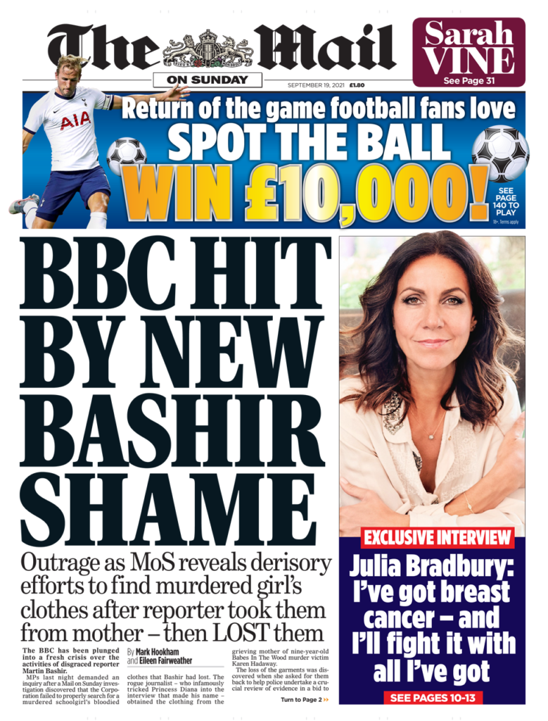 Η Mail της Κυριακής αναφέρει ότι το BBC έχει «βυθιστεί σε μια νέα κρίση» σχετικά με τις δραστηριότητες του δημοσιογράφου Martin Bashir. Η εφημερίδα γράφει ότι απέτυχε να αναζητήσει σωστά τα ματωμένα ρούχα μιας δολοφονημένης μαθήτριας που είχαν χαθεί από τον Bashir, ο οποίος εκείνη την εποχή εργαζόταν στο BBC. Το BBC και ο κ. Bashir έχουν ζητήσει συγγνώμη και για τις συνθήκες που σχετίζονται με την απώλεια των ρούχων. “Τώρα οι συσκευές εισπνοής κατηγορούνται για την υπερθέρμανση του πλανήτη”, είναι ένας ακόμη τίτλος στη Mail της Κυριακής, αφού η GlaxoSmithKline δήλωσε ότι οι συσκευές ήταν η μεγαλύτερη μοναδική πηγή εκπομπών αερίων θερμοκηπίου. Η Mail αναφέρει ότι η φαρμακευτική εταιρεία έχει ξεκινήσει τώρα τη διαδικασία εύρεσης διαδόχου της μπλε συσκευής εισπνοής Ventolin.