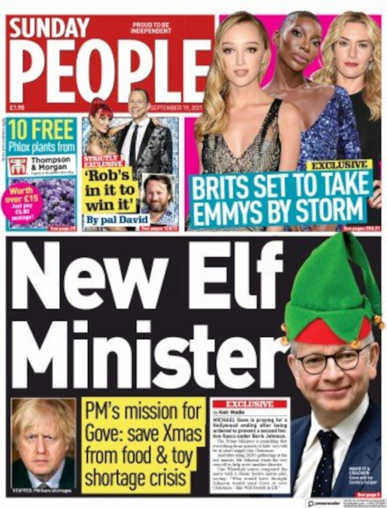 Το έργο της εξασφάλισης ότι τα τρόφιμα και τα παιχνίδια δεν θα είναι σε έλλειψη έχει ανατεθεί στον Michael Gove, τον «Νέο Υπουργό των Ξωτικών» σύμφωνα με τους Sunday People. Πηγή του Whitehall εξηγεί ότι ο κ. Gove θα είναι επικεφαλής της Εθνικής Ομάδας Οικονομικής Ανάκαμψης, ενώ η αποστολή του περιγράφεται βασικά ως “η Επιτροπή για τη διάσωση των Χριστουγέννων”. Ο Gove, γράφει η εφημερίδα, προσεύχεται για ένα Χολιγουντιανό τέλος αφού του ανατέθηκε να αποτρέψει ένα δεύτερο εορταστικό φιάσκο και να βοηθήσει στην αποφυγή μιας άλλης καταστροφής υπό τον Μπόρις Τζόνσον, ο οποίος έχει πανικοβληθεί ότι τα πάντα θα είναι σε έλλειψη αυτά τα Χριστούγεννα. Η ίδια πηγή του Whitehall συνέκρινε την κίνηση με την κλασική εορταστική ταινία, λέγοντας: «Ποιος θα πίστευε ότι ο Johnson θα έστελνε τον Gove για να σώσει τα Χριστούγεννα, όπως ο Will Ferrell στο Elf».