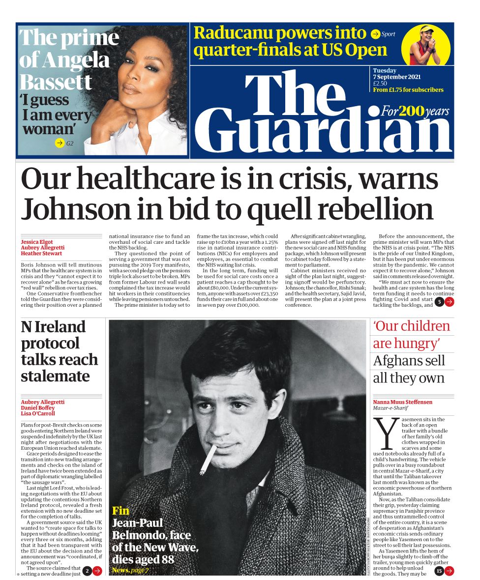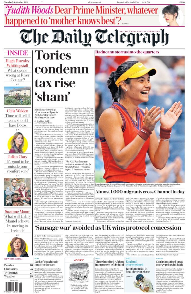 Ο Τζόνσον αναμένεται να ανακοινώσει στους αντάρτες βουλευτές πως δεν μπορούν να περιμένουν ότι το σύστημα υγείας θα «ανακάμψει μόνο του», γράφει η Guardian, η οποία αναφέρει ότι βουλευτές σε πρώην έδρες των Εργατικών «κόκκινου τείχους» διαμαρτύρονται ότι η αύξηση θα πλήξει τους εργαζόμενους ενώ θα αφήσει τους συνταξιούχους ανέγγιχτους και όπως ένας επικεφαλής τους είπε, “εξετάζουν τη θέση τους”. Η εφημερίδα έδωσε έναν αριθμό στην αναμενόμενη αύξηση φόρου, λέγοντας ότι η Εθνική Ασφάλιση θα αυξηθεί κατά περίπου 1,25%. Η εφημερίδα αναφέρει επίσης ότι οι συνομιλίες μεταξύ Ηνωμένου Βασιλείου και Ε.Ε. για το πρωτόκολλο της Βόρειας Ιρλανδίας έχουν φτάσει σε αδιέξοδο.
