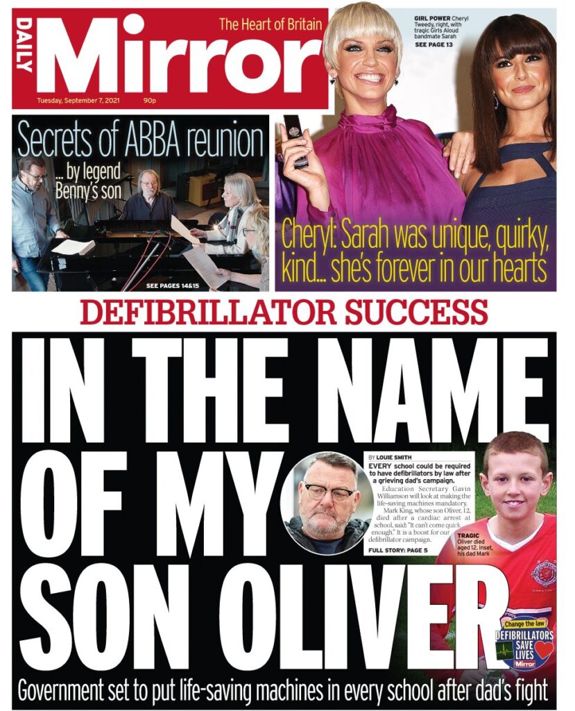 Η Daily Mirror αναφέρει ότι κάθε σχολείο θα μπορούσε να αναγκαστεί βάση νόμου να έχει απινιδωτές καθώς επικεντρώνεται στην εκστρατεία ενός συντετριμμένου πατέρα, του Μαρκ Κινγκ, ο γιος του οποίου, ο Όλιβερ, 12 ετών, πέθανε μετά από καρδιακή ανακοπή κατά τη διάρκεια ενός αγώνα κολύμβησης σε ένα σχολείο που δεν είχε απινιδωτή. Ο υπουργός Παιδείας, Γκάβιν Γουίλιαμσον, ο οποίος συναντήθηκε με τον κ. Κινγκ, είπε ότι η κυβέρνηση εξετάζει την αλλαγή του νόμου.