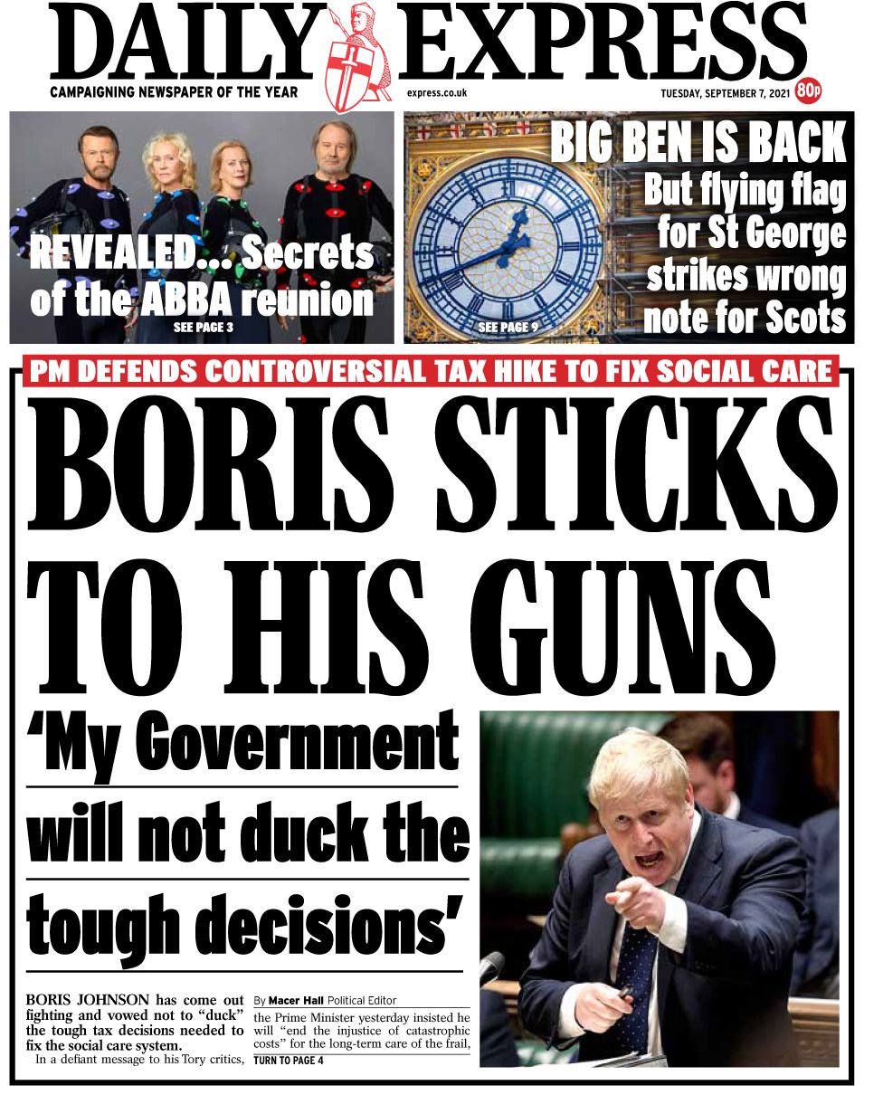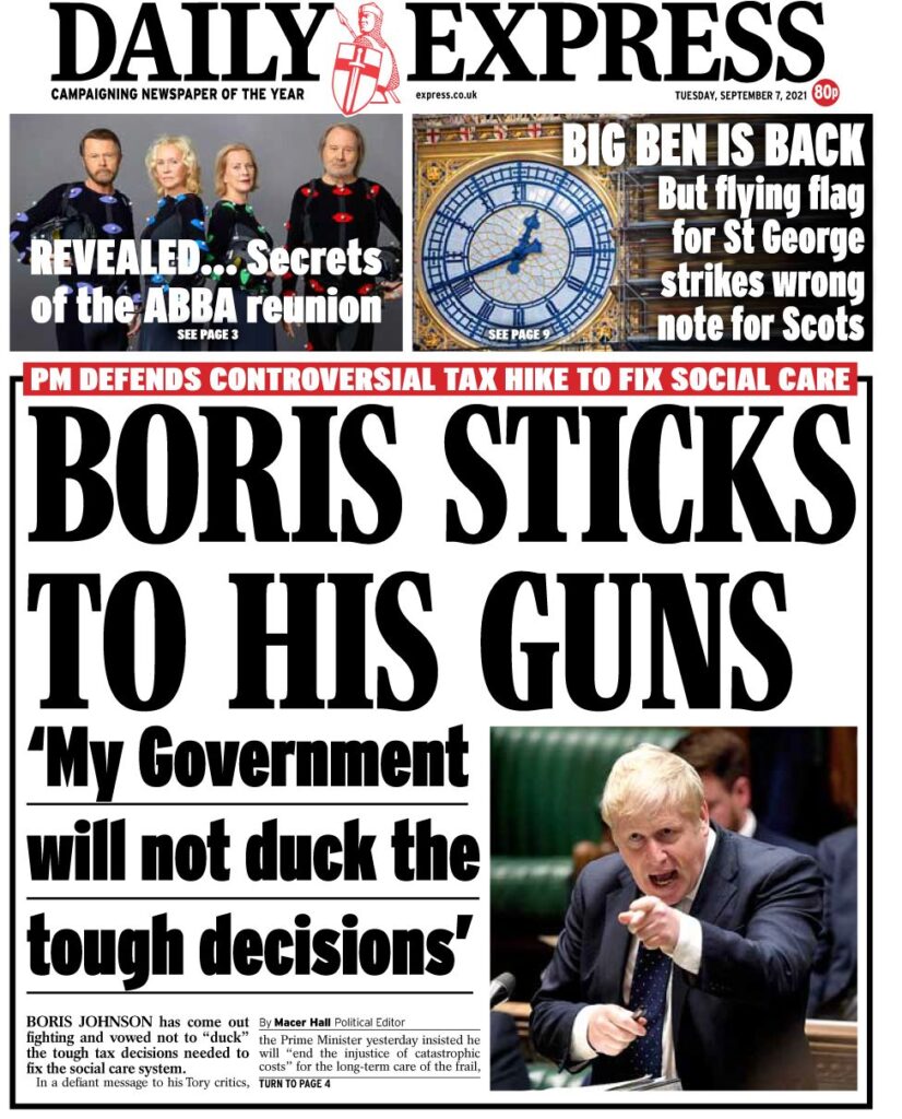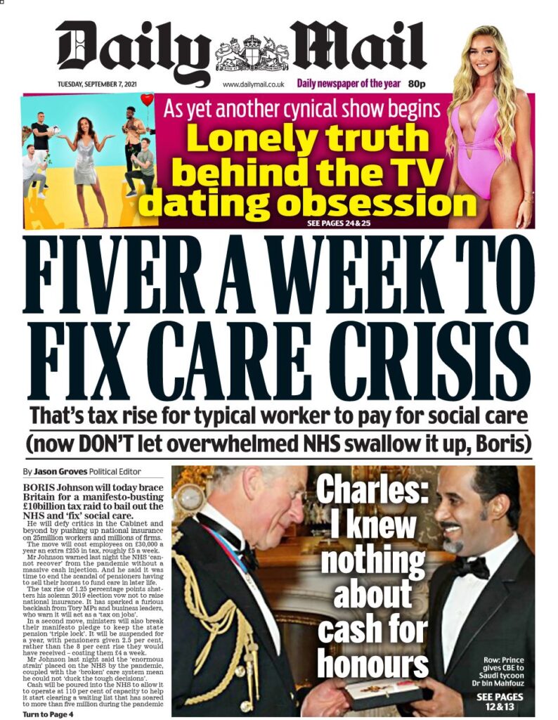 «Πέντε λίρες την εβδομάδα για να διορθώσετε την κρίση της περίθαλψης» είναι ο τίτλος της Daily Mail, που γράφει ότι αυτό είναι το επιπλέον πόσο που θα χρειαστεί να πληρώσει ο μέσος εργαζόμενος για την αύξηση των φόρων. Η εφημερίδα σημειώνει ότι ο Μπόρις Τζόνσον αξίζει τα εύσημα για την κατανόηση του προβλήματος της κοινωνικής φροντίδας, αναφέρει ωστόσο ότι η κίνηση προκάλεσε την οργισμένη αντίδραση από το Συντηρητικό κόμμα και προειδοποιεί τον πρωθυπουργό ότι τα χρήματα “θα εξαφανιστούν στη μαύρη τρύπα των δαπανών του NHS” χωρίς να λυθεί το πρόβλημα.