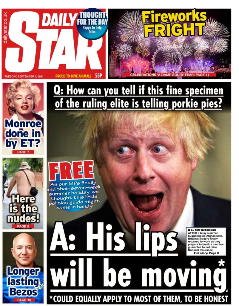 Η Daily Star υιοθετεί μια ειρωνική προσέγγιση καθώς προσφέρει έναν εύχρηστο μικρό οδηγό πολιτικής, που όπως λέει θα είναι εξαιρετικά χρήσιμος, καθώς επιτέλους, ο Πρωθυπουργός επιστρέφει στα καθήκοντά του μετά από τις εφτά-εβδομάδες καλοκαιρινών διακοπών του.