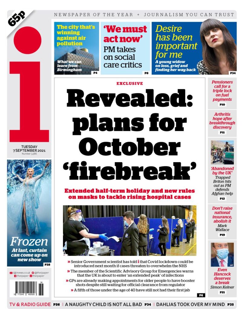 Ένα νέο lockdown θα μπορούσε να ανακοινωθεί τον επόμενο μήνα, για την αντιμετώπιση των εισαγωγών στα νοσοκομεία από τον Covid, εάν τα κρούσματα αυξηθούν κατακόρυφα, σύμφωνα με την εφημερίδα i. Επιστήμονας από τη συμβουλευτική ομάδα Sage, που επιθυμεί την ανωνυμία του, είπε στην εφημερίδα ότι οι διακοπές του φθινοπωρινού εξαμήνου θα μπορούσαν να παραταθούν για δύο εβδομάδες και να γίνει υποχρεωτική η χρήση μάσκας για το “σχέδιο «φωτιά» για τον Οκτώβριο”. Ωστόσο η εφημερίδα ισχυρίζεται ότι ένα καθολικό lockdown, θα ήταν απίθανο. Η εφημερίδα επικαλούμενη τον εν λόγω επιστήμονα, γράφει πως το μέτρο θα μπορούσε να εισαχθεί τον επόμενο μήνα ενώ υπήρξαν προειδοποιήσεις για μια «παρατεταμένη κορύφωση» των κρουσμάτων.