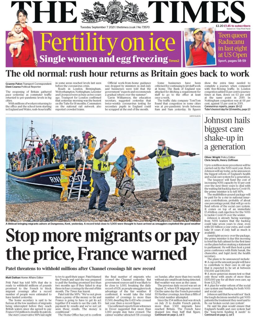 Οι Times επικεντρώνονται στην υπουργό Εσωτερικών, Priti Patel, η οποία απειλεί ότι θα παρακρατήσει εκατομμύρια λίρες που υποσχέθηκε στους Γάλλους για να εμποδίσουν τις διέλευσεις σκαφών με μετανάστες από τη Μάγχη. Η εφημερίδα αναφέρει ότι η Πρίτι Πατέλ συναντήθηκε με τους Συντηρητικούς βουλευτές χθες το βράδυ, καθώς ένας αριθμός ρεκόρ ανθρώπων εκτιμάται ότι έφτασε τη Δευτέρα στο Ηνωμένο Βασίλειο. Η εφημερίδα σημειώνει ότι η υπουργός Εσωτερικών φέρεται να είναι έξαλλη για τον χαμηλό αριθμό μεταναστών που αναχαιτίζονται πριν φτάσουν στα βρετανικά ύδατα, αφού συμφώνησε να πληρώσει 54 εκατομμύρια λίρες στη Γαλλία για να τη βοηθήσει να διπλασιάσει τις περιπολίες της. “Η Γαλλία θα πρέπει να αναλάβει δράση, εάν θέλει να δει τα μετρητά. Είναι πληρωμή βάσει αποτελεσμάτων”, φέρεται να είπε.