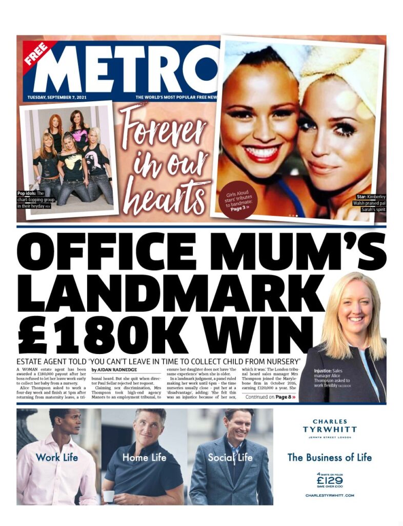 Η Metro αποκαλύπτει την υπόθεση μιας κτηματομεσίτριας στην οποία έχουν αποδοθεί 180.000 λίρες από δικαστήριο, αφού το αφεντικό της αρνήθηκε να την αφήσει να φύγει νωρίς από τη δουλειά για να παραλάβει το μωρό της από το νηπιαγωγείο. Η εφημερίδα χαρακτηρίζει το γεγονός ως μια υπόθεση “ορόσημο”.