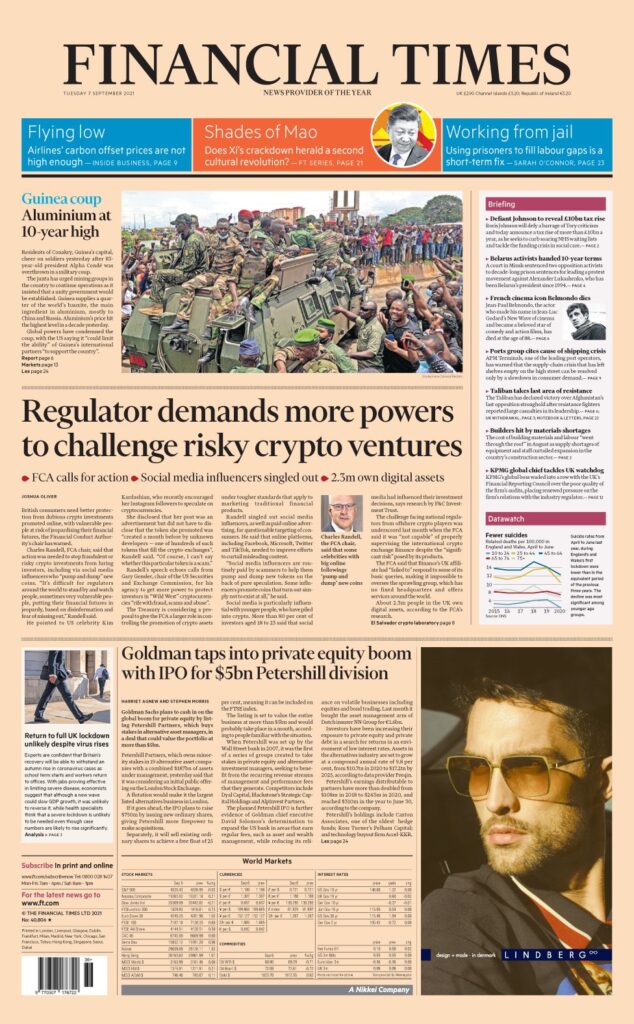 Οι Financial Times αναφέρουν ότι ο οικονομικός παρατηρητής απαιτεί περισσότερες εξουσίες για την αντιμετώπιση επικίνδυνων επιχειρήσεων κρυπτονομισμάτων, καθώς προειδοποιεί ότι τα ευάλωτα άτομα κινδυνεύουν να θέσουν σε κίνδυνο το οικονομικό τους μέλλον. Ο Τσαρλς Ράντελ, πρόεδρος της Αρχής Χρηματοπιστωτικής Συμπεριφοράς, λέει ότι απαιτείται δράση για να σταματήσουν οι δόλιες ή επικίνδυνες επενδύσεις που δελεάζουν τους επενδυτές, μεταξύ άλλων μέσω επιρροών στα μέσα κοινωνικής δικτύωσης. Ο Ράντελ, επικρίνει διασημότητες όπως η Kim Kardashian, οι οποίες πληρώνονται για να προωθήσουν το Bitcoin. Η εφημερίδα αναφέρει ότι το Υπουργείο Οικονομικών εξετάζει το ενδεχόμενο να δώσει στην FCA μεγαλύτερο ρόλο στη ρύθμιση της προώθησης κρυπτογραφικών περιουσιακών στοιχείων.