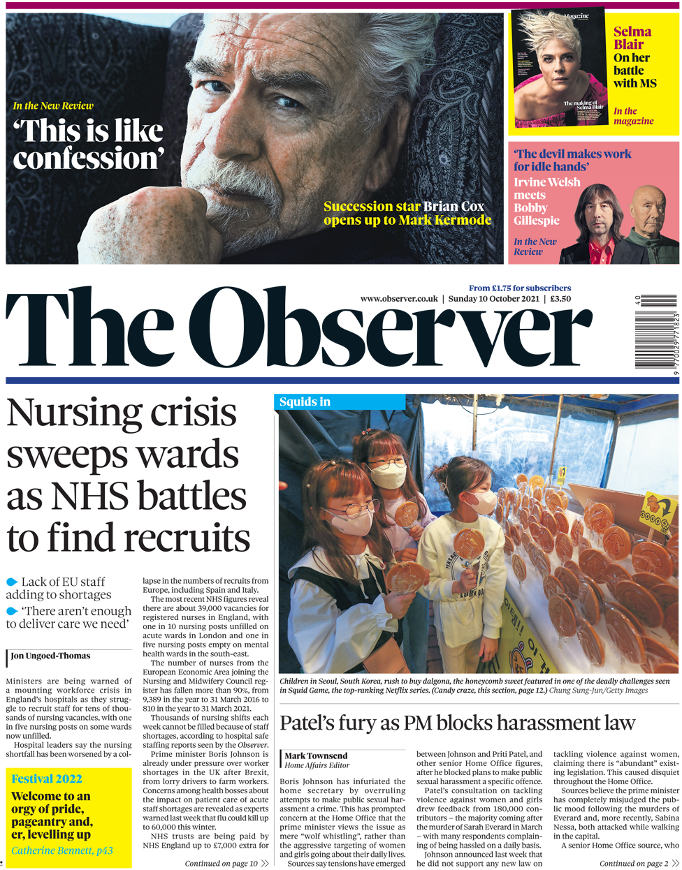 Ο Observer επικεντρώνεται στη νοσηλευτική «κρίση» που αντιμετωπίζουν τα νοσοκομεία της Αγγλίας καθώς αγωνίζονται να προσλάβουν προσωπικό, με δεκάδες χιλιάδες θέσεις να μην έχουν συμπληρωθεί. Μία στις πέντε θέσεις νοσηλευτικής είναι κενές, σύμφωνα με την εφημερίδα, με την κατάσταση να επιδεινώνεται ιδιαίτερα από τη μείωση των προσλήψεων από την Ευρώπη. Εν τω μεταξύ, η εφημερίδα ασχολείται με την κρίση που έχει ξεσπάσει στην Downing Street, μεταξύ του Boris Johnson και της υπουργού Εσωτερικών Priti Patel την οποία έχει εξοργίσει το γεγονός ότι ο Πρωθυπουργός απέρριψε τις προσπάθειες να καταστήσει τη δημόσια σεξουαλική παρενόχληση έγκλημα, μη υποστηρίζοντας τη δημιουργία ενός νέου νόμου για την αντιμετώπιση της βίας κατά των γυναικών μετά τη δολοφονία της Sarah Everard. Πιστεύει πως υπάρχει ανησυχία καθώς ο πρωθυπουργός έχει εκτιμήσει εντελώς λάθος την κατάσταση, θεωρώντας ότι το θέμα αφορά «το σφύριγμα στο δρόμο» και όχι την επιθετική στόχευση γυναικών και κοριτσιών.
