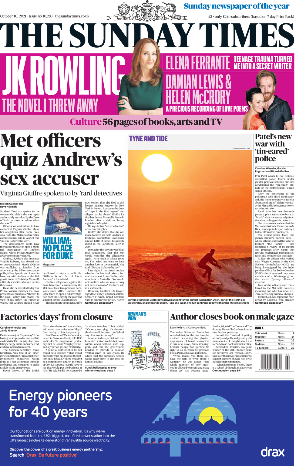 Η υπουργός Εσωτερικών αντιμετωπίζει μια ακόμη μάχη, αναφέρουν οι Sunday Times. Η κυρία Patel κατέστησε σαφές ότι η Επίτροπος της Μητροπολιτικής Αστυνομίας, Dress Cressida Dick, παρέμεινε στη θέση λόγω έλλειψης εναλλακτικών υποψηφίων. Εν τω μεταξύ, η εφημερίδα λέει ότι η Σκότλαντ Γιαρντ μίλησε στη Virginia Giuffre, για τους ισχυρισμούς της κατά του Δούκα της Υόρκης, ο οποίος λέει ότι την κακοποίησε σεξουαλικά όταν ήταν 17 ετών. Η δικαιοσύνη, η οποία έχει εξετάσει τις αγωγές σε δύο προηγούμενες περιπτώσεις, αλλά ποτέ δεν άνοιξε πλήρη έρευνα, εξέδωσε μια δήλωση στην οποία ανέφερε ότι δεν θα επιβεβαιώσει με ποιους μπορεί ή όχι να έχει μιλήσει, ενώ ο πρίγκιπας Άντριου αρνήθηκε κατηγορηματικά τους ισχυρισμούς της κυρίας Guiffre. Οι Sunday Times αποκαλύπτουν επίσης ότι, τα εργοστάσια απέχουν ελάχιστα από τη διακοπή της παραγωγής και ότι ο κ. Kwarteng πρόκειται να ζητήσει από τον καγκελάριο να σώσει τις μεταποιητικές βιομηχανίες.