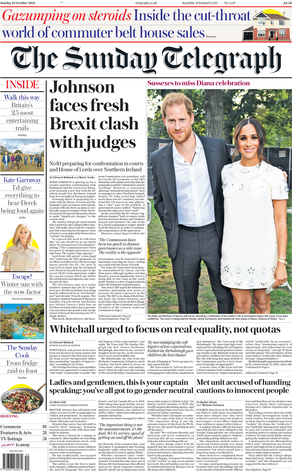 Ο πρωθυπουργός αντιμετωπίζει μια νέα «σύγκρουση Brexit» με δικαστές, σύμφωνα με την Sunday Telegraph. Η εφημερίδα αποκαλύπτει ότι ο Τζόνσον «προετοιμάζεται» για μια αντιπαράθεση με το Κοινοβούλιο και τα δικαστήρια καθώς αναζητά μια νέα συμφωνία με την Ευρωπαϊκή Ένωση, η οποία θα απαλλάξει τη Βόρεια Ιρλανδία από την εποπτεία των ευρωπαίων δικαστών. Αξιωματούχοι καταρτίζουν σχέδια για να αναστείλουν μονομερώς τμήματα του Πρωτοκόλλου της Βόρειας Ιρλανδίας, εκτός εάν συμφωνήσουν οι Βρυξέλλες “σημαντικές αλλαγές” στην τρέχουσα συμφωνία, αναφέρει η εφημερίδα. Σύμφωνα με την Sunday Telegraph, οι πιλότοι και το πλήρωμα θαλάμου επιβατών στις πτήσεις της British Airways δεν θα απευθύνονται πλέον στους επιβάτες ως “κυρίες και κύριοι”. Λέγεται ότι η αεροπορική εταιρεία επιθυμεί να καταφέρει να κάνει και τα «παιδιά να αισθάνονται ότι συμπεριλαμβάνονται στις ανακοινώσεις» και να «σέβονται ευρύτερα κοινωνικά πρότυπα». Ο ιδρυτής του μεγαλύτερου διαφημιστικού πρακτορείου στον κόσμο, ο Sir Martin Sorrell, λέει στην Telegraph ότι είναι ένα σημάδι της εποχής, αλλά ότι οι χαιρετισμοί δεν είναι σημαντικοί, μόνο η εξυπηρέτηση, το φαγητό, το wifi και η ταχύτητα στην επιβίβαση και την αποβίβαση στο αεροπλάνο.