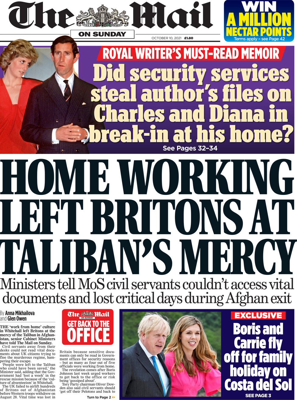 Η Mail on Sunday αναφέρει ότι η εργασία στο σπίτι σήμαινε ότι οι δημόσιοι υπάλληλοι δεν μπορούσαν να έχουν πρόσβαση σε βασικά έγγραφα κατά τη διάρκεια της εκκένωσης από το Αφγανιστάν, αφήνοντας τους Βρετανούς στο «έλεος» των Ταλιμπάν. Η εφημερίδα μίλησε με υπουργούς, ένας από τους οποίους είπε: «Οι άνθρωποι αφέθηκαν στους Ταλιμπάν, ενώ θα μπορούσαν να είχαν σωθεί». Η πηγή πρόσθεσε ότι χάθηκε μια εβδομάδα στην αποστολή διάσωσης. Η Mail on Sunday, αναφερόμενη στις φήμες ότι ο πρωθυπουργός επέλεξε  να κάνει διακοπές αυτήν την περίοδο, γράφει ότι ενώ οι επικριτές θα πουν ότι εγκατέλειψε τη θέση του εν μέσω μιας σειράς σοβαρών κρίσεων στην Βρετανία, οι σύμμαχοί του θα παροτρύνουν τον κόσμο να τον αφήσει να κάνει ένα διάλειμμα. Λένε ότι δεν πήγε διακοπές στο εξωτερικό εδώ και 21 μήνες, κατά την διάρκεια των οποίων, «παραλίγο να πεθάνει, ηγήθηκε του έθνους μέσω του Covid και απέκτησε ένα μωρό», ενώ προσθέτει ότι η άφιξη ενός άλλου μωρού έρχεται και η μητέρα του πέθανε τον Σεπτέμβριο.