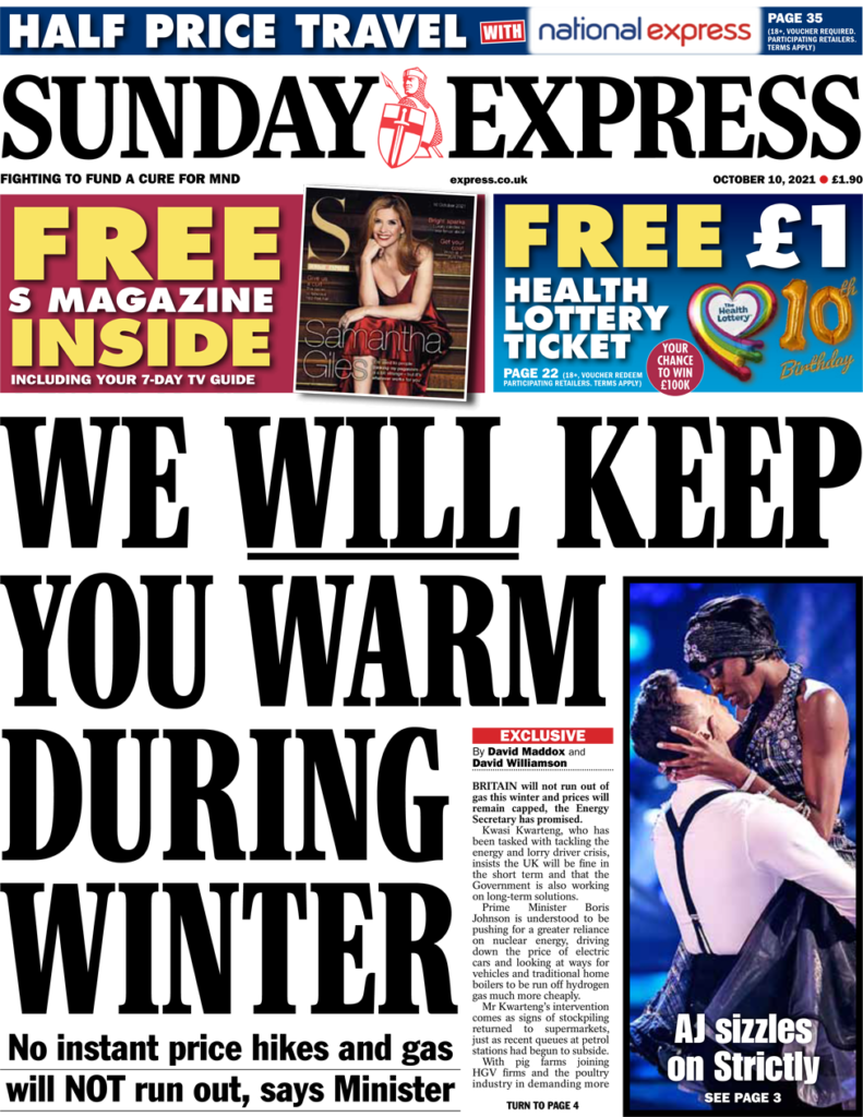 Η Sunday Express υποβαθμίζει την ενεργειακή κρίση, αναφερόμενη στα σχόλια του υπουργού Εργασίας και Ενέργειας, Kwasi Kwarteng ότι η Βρετανία δεν θα ξεμείνει από φυσικό αέριο αυτό το χειμώνα και ότι οι τιμές θα περιοριστούν. Ο κ. Kwarteng είπε ότι το Ηνωμένο Βασίλειο θα είναι καλά βραχυπρόθεσμα και η κυβέρνηση εργάζεται για μακροπρόθεσμες λύσεις. Η εφημερίδα συνοψίζει τις διαβεβαιώσεις που επιδιώκει ο υπουργός να προσφέρει στα νοικοκυριά σχετικά με τις προμήθειες φυσικού αερίου, με τον τίτλο: “Θα σας κρατήσουμε ζεστούς κατά τη διάρκεια του χειμώνα”.